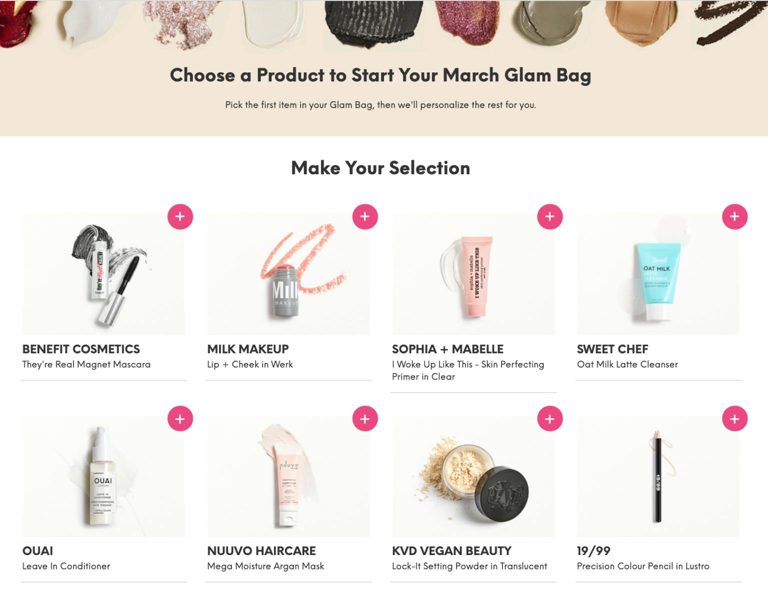 After taking the Beauty Quiz, new members choose their monthly subscription plan. IPSY offers three tiers for its subscription plan as of February 2024: Glam Bag, BoxyCharm, and Icon Box. Members can also add a Refreshments subscription for personal care products. Using quiz data, IPSY curates each box to match members' beauty needs and preferences. The customized products — including makeup, skincare, haircare, and more — arrive in a collectible makeup bag.
