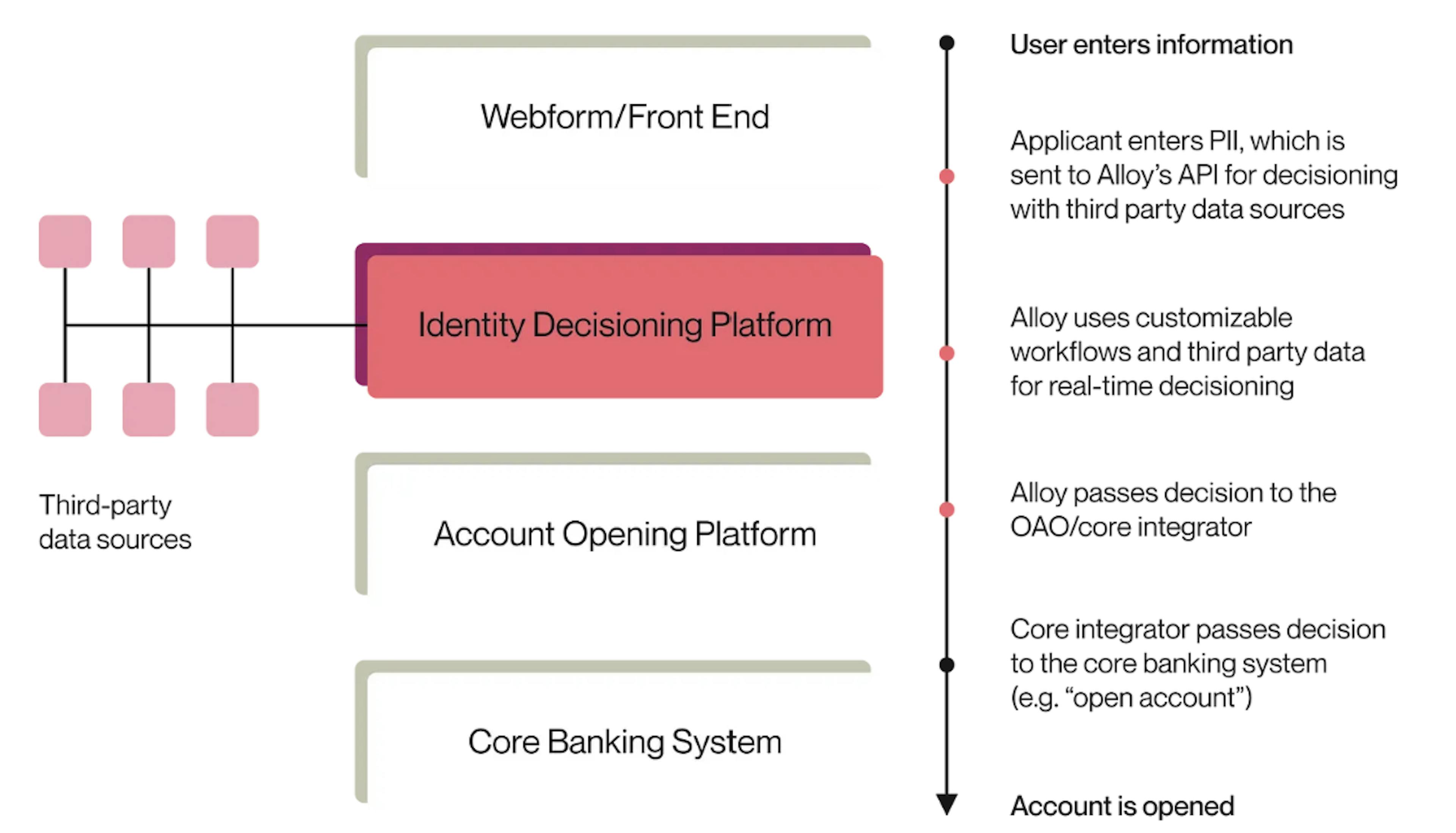 Alloy's platform is designed to be adaptable, allowing institutions to scale their risk management processes as their business grows and as regulatory landscapes evolve. The platform supports rapid configuration and deployment of additional anti-fraud measures, integration of new data partners, and expansion into additional geographies.