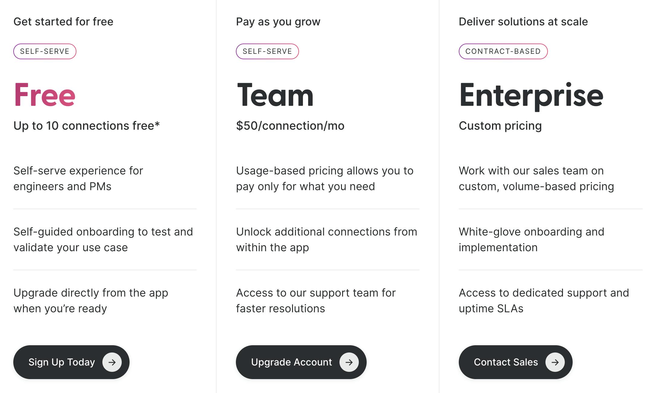 For Alloy Automation’s Unified API, customers who have less than 10 connections per month are totally free. Beyond that, teams pay $50/month. Customers can also contact Alloy Automation’s sales team to get a volume-based pricing plan.