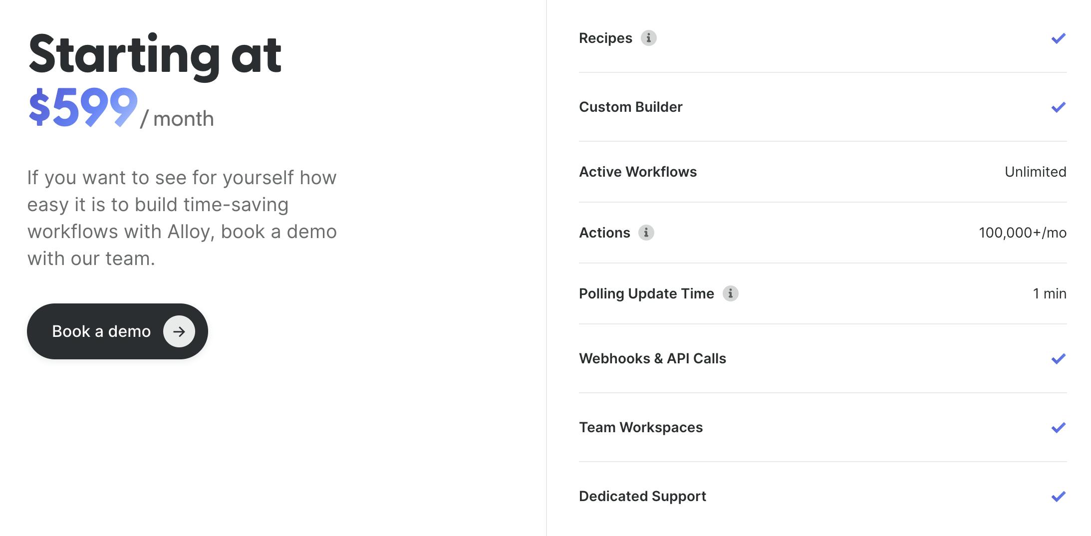 Alloy Automation offers a few different pricing plans depending on user needs and product lines across Alloy Embedded, Alloy Unified API, and Alloy Flow.