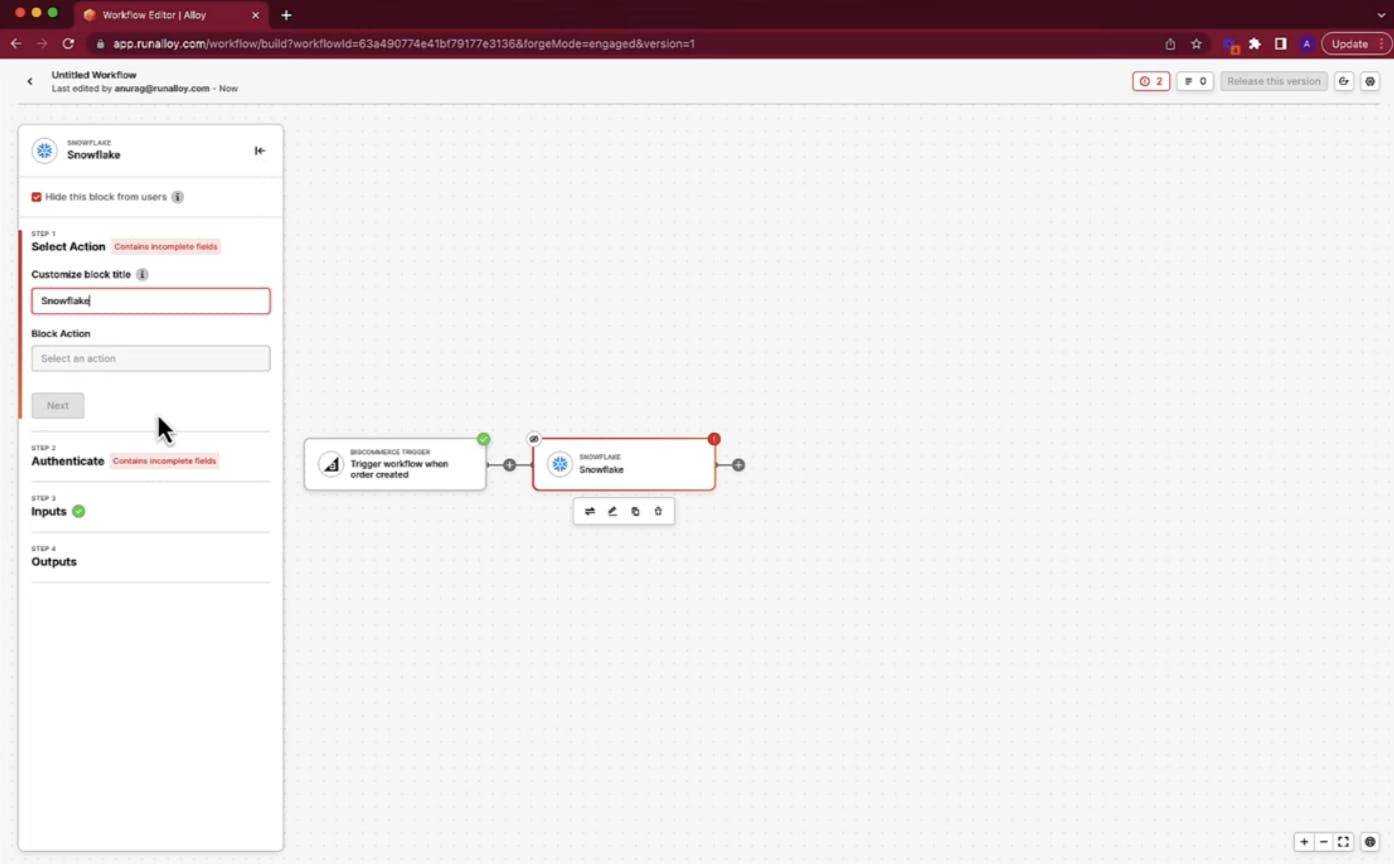 The integration isn’t useful until the company defines which workflows it should automate. To do so, a company would select the BigCommerce integration to create a new workflow. Suppose the process someone is trying to automate is the storing of the data associated with an order placed via BigCommerce to a data warehouse like Snowflake. The next action, then, is to define what event should trigger the workflow, such as an order being created on BigCommerce. The user then chooses what to do after the order is created, in this case, inserting data into Snowflake. Once this is complete, users click “Release this version”, and the workflow will be ready to go.
