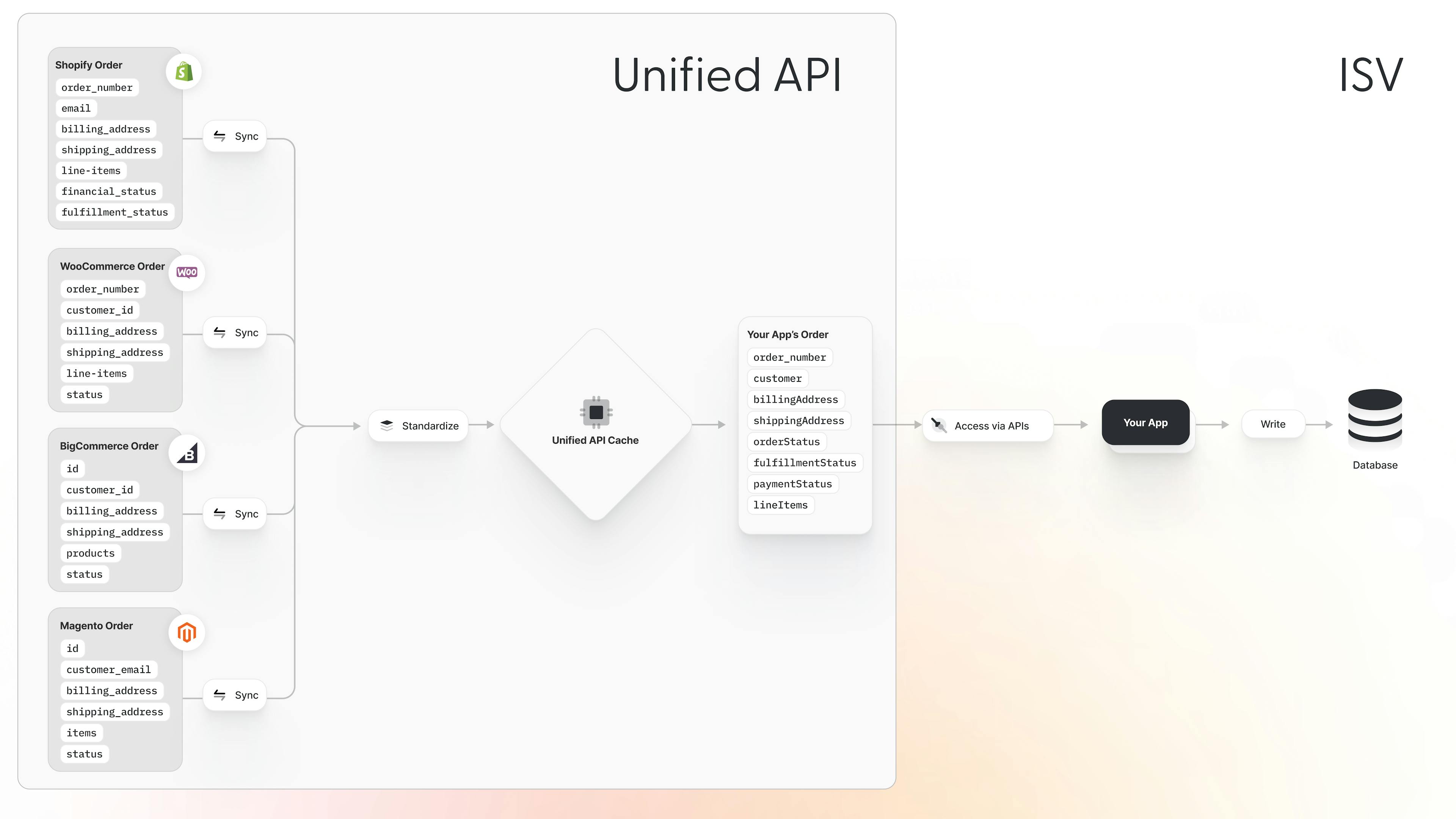 One ideal use case is read-write integrations, in which users might be receiving order information from Shopify, BigCommerce, and other platforms, and adding this data to an internal database. Let’s say an order is placed through Shopify. On the back end, Shopify will create a piece of data corresponding with that order, including information (fields) such as the billing address, shipping address, item ordered, etc. Orders placed through BigCommerce will also generate a piece of data, but there may be slight differences. For instance, perhaps Shopify’s data fields include the end user’s email, whereas BigCommerce instead stores a unique customer ID. That means that Shopify’s data schema differs from BigCommerce’s.