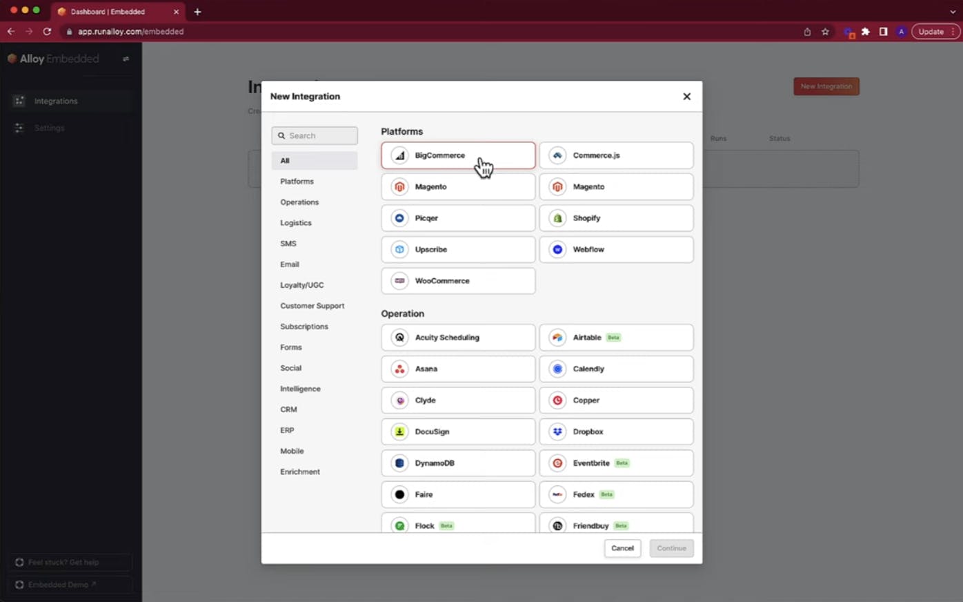 Suppose a business wanted to design its application so that it can communicate with a commerce platform such as BigCommerce. The first step would be to create a new integration with one of Alloy Automation’s 200+ supported applications that span categories ranging from data warehouse to customer support to loyalty programs.