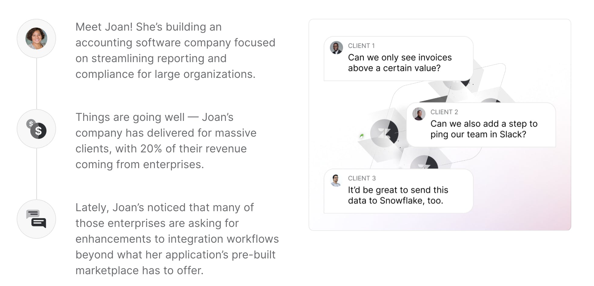 The problem: as the complexity and quantity of different software tools increase, enterprises are struggling to integrate across all these tools, leading to challenges including data synchronization, security and compliance, and authentication. 25% of organizations have a six-month backlog on workflow integration requests. 58% of organizations said that their IT staff are spending five or more hours of work each week on repetitive tasks including data entry. 47% believe that internal APIs don’t adhere to security standards and an additional 19% are unsure whether or not they do.