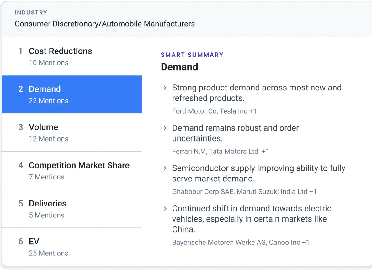 AlphaSense also offers Smart Summary to analyze and distill insights on an entire industry. These summaries provide an overview of industry concerns, strategic priorities, and earnings performance, allowing users to understand market trends and challenges without diving into multiple reports.