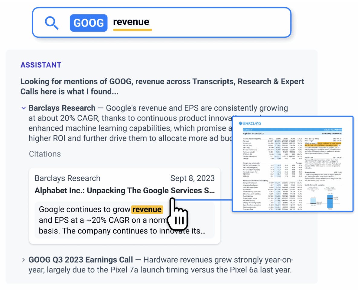 The feature also includes Assistant, an AI-powered chatbot designed to summarize “billions of data points” into a simple answer. Assistant is a proprietary LLM that was trained and fine-tuned on AlphaSense’s company document library. It synthesizes data from over 10K content sources and provides in-line citations to make each answer verifiable.