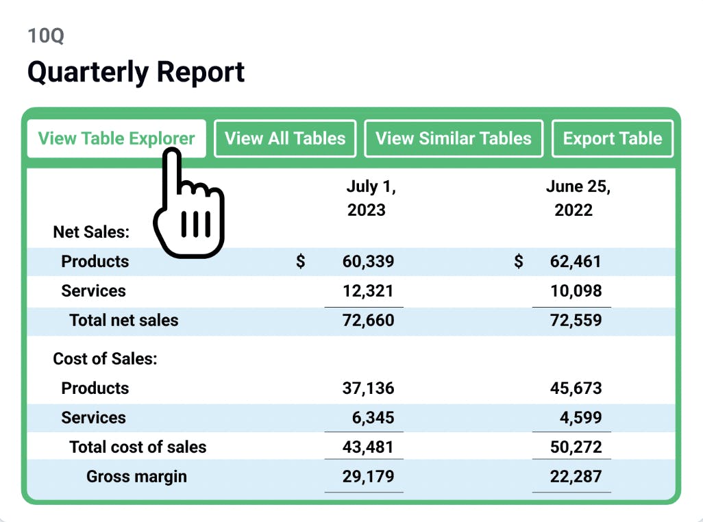 AlphaSense searches can also include charts, tables, and images from company presentations and reports. Its Table Explorer tool allows users to automatically edit and calculate financial metrics from these searches and export directly to Excel.