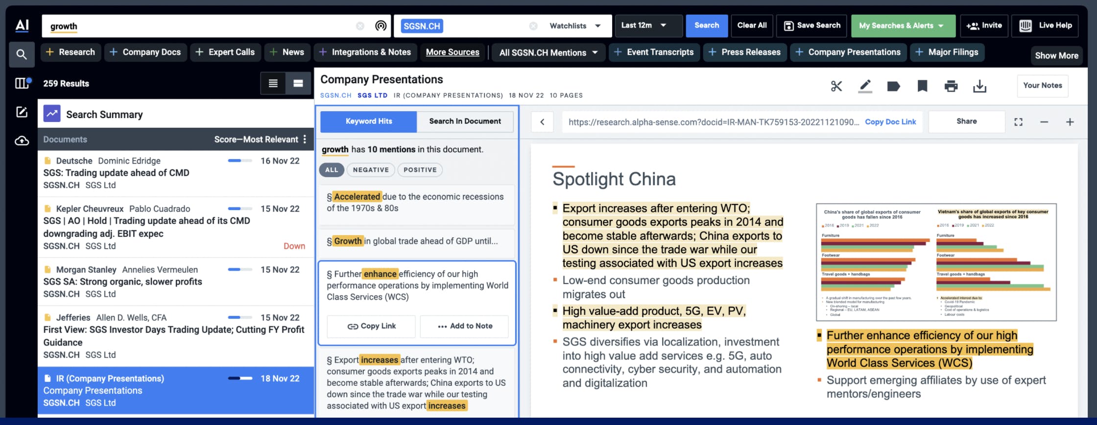 Platform Interface: AlphaSense’s interface gives users a three-pane view to browse different layers of content: a list of relevant documents, document keyword mentions, and the document itself. This interface is patented and was designed to reduce the number of clicks users spend on synthesizing search results.
