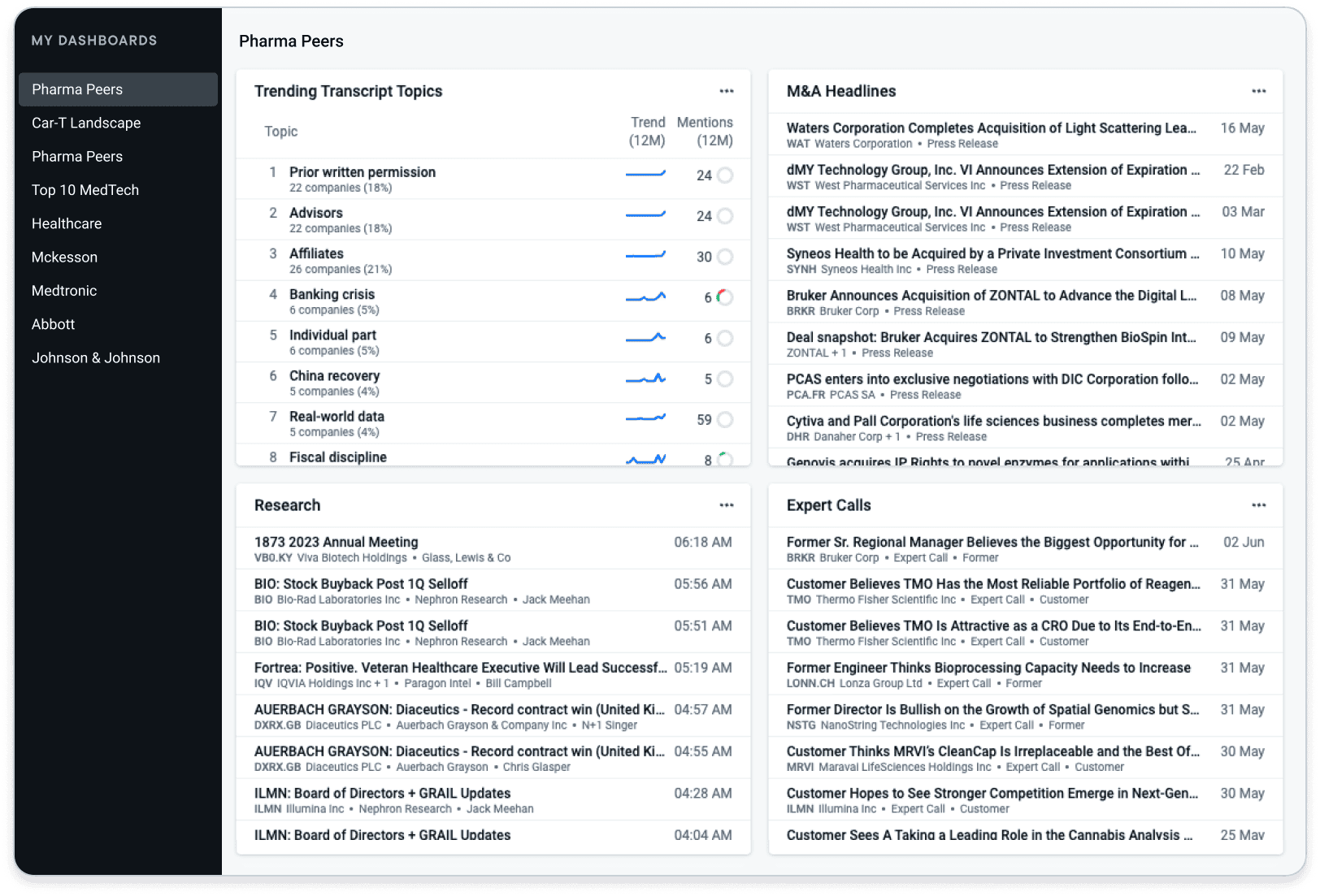 News: AlphaSense delivers news from newspapers, trade journals, and other media sources across industries including health care, real estate, technology, aerospace, industrials, defense, transportation, and energy.