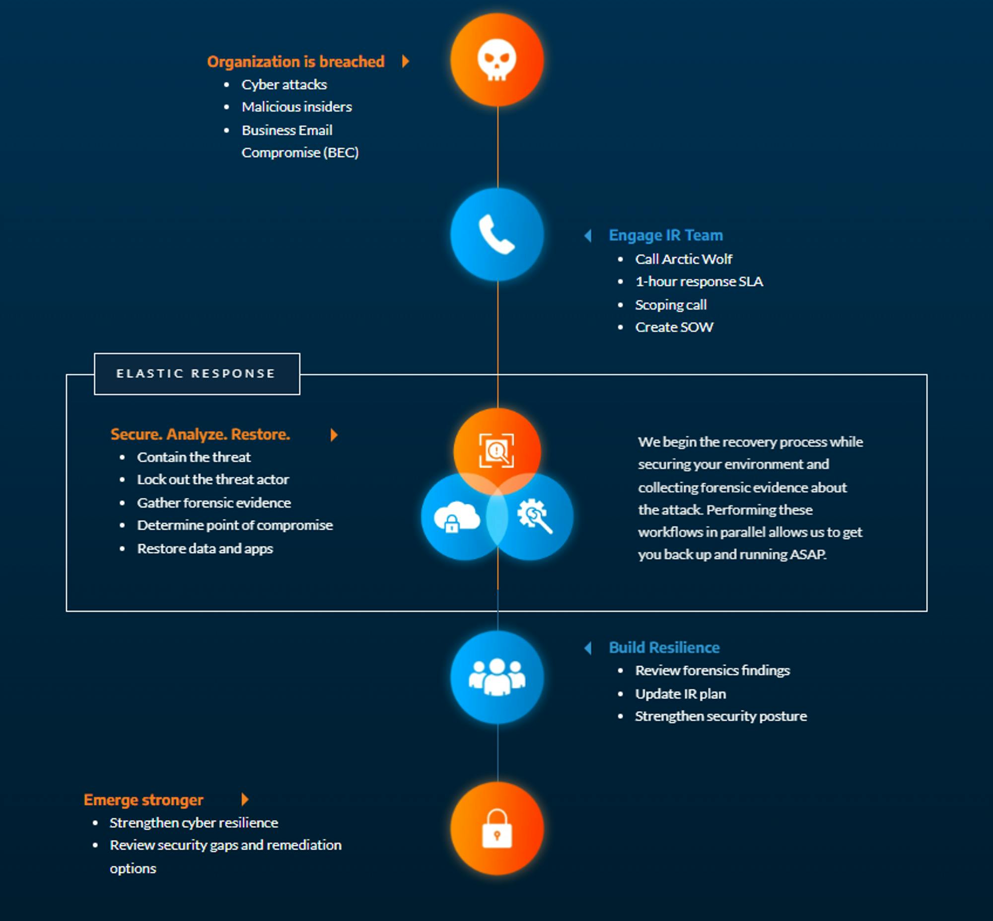 Arctic Wolf’s Incident Response solution is intended to minimize the damage caused by cyber incidents such as ransomware, IP theft, data breach, email compromisation, and employee misconduct. Arctic Wolf provides incident analysis and restoration services intended to resolve incidents as quickly and efficiently as possible. The Incident Response solution can be pre-purchased via the Arctic Wolf IR JumpStart Retainer.