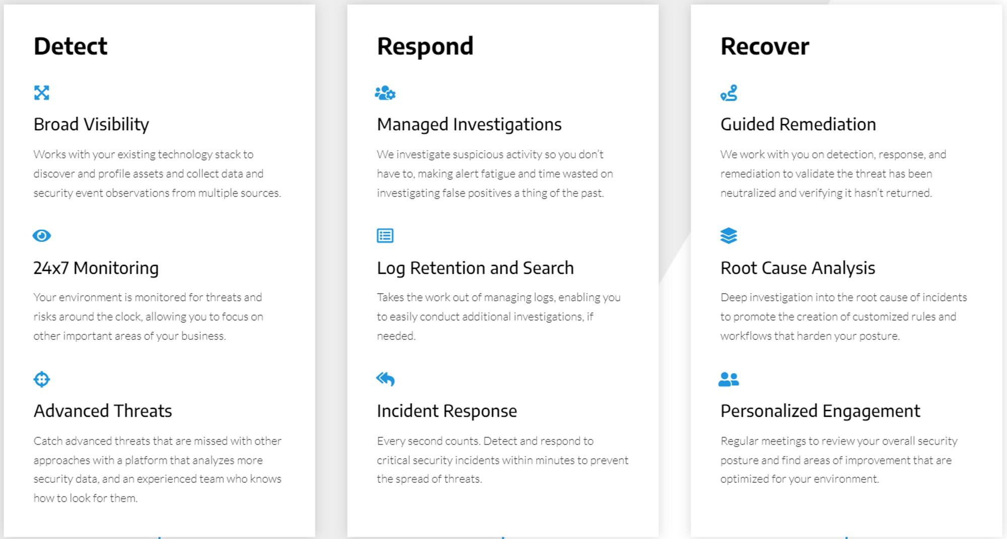 After threats are detected, Arctic Wolf provides managed investigation services. Arctic Wolf takes ownership of cybersecurity threat response in an effort to save clients time and resources that are required for handling threat detection responses internally. Once threats are eliminated, Arctic Wolf guides clients on remediating any damage and provides a ‘root cause analysis’ to prevent future incidents.