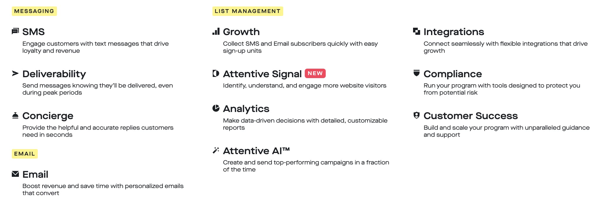 Attentive’s core product is SMS messaging between businesses and their customers. Attentive’s messaging product suite (1) provides the ability to compose marketing messages (2) ensures the delivery of messages, and (3) enables long-lasting customer communication.