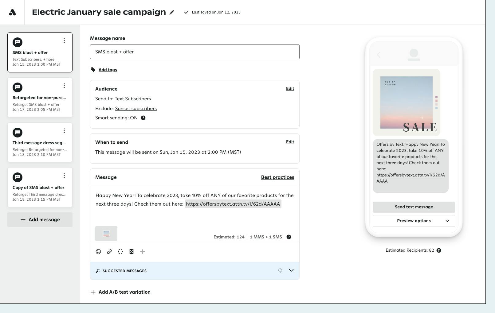 SMS communication on Attentive can be categorized into two message types: campaigns and journeys. Campaigns are one-time messages that are mainly used for promoting time-sensitive information such as discounts or new releases. With Campaign Composer, brands can write an SMS message, select an audience, and a time.