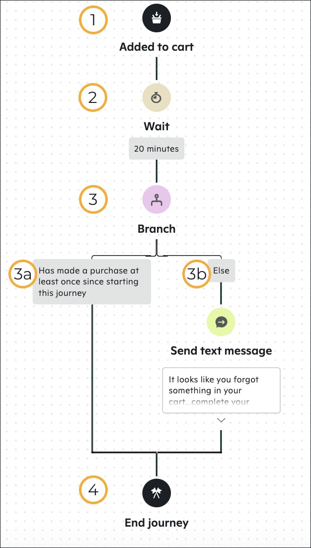 Journeys are triggered messages where companies can send messages depending on each user’s activity and characteristics. At the beginning of each journey is a trigger user action such as adding an item to a cart or opting into messaging. From there, the journey operates similarly to ‘if/else’ statements: depending on whether a user meets a condition, the user will experience a specific set of prompts. For example, in the image below, if the user makes a purchase, the journey will end. Otherwise, the user will receive a text message reminding them about their cart. These messages are best for capitalizing on critical points in the customer lifecycle such as new subscribers, an abandoned cart, and post-purchase messages.