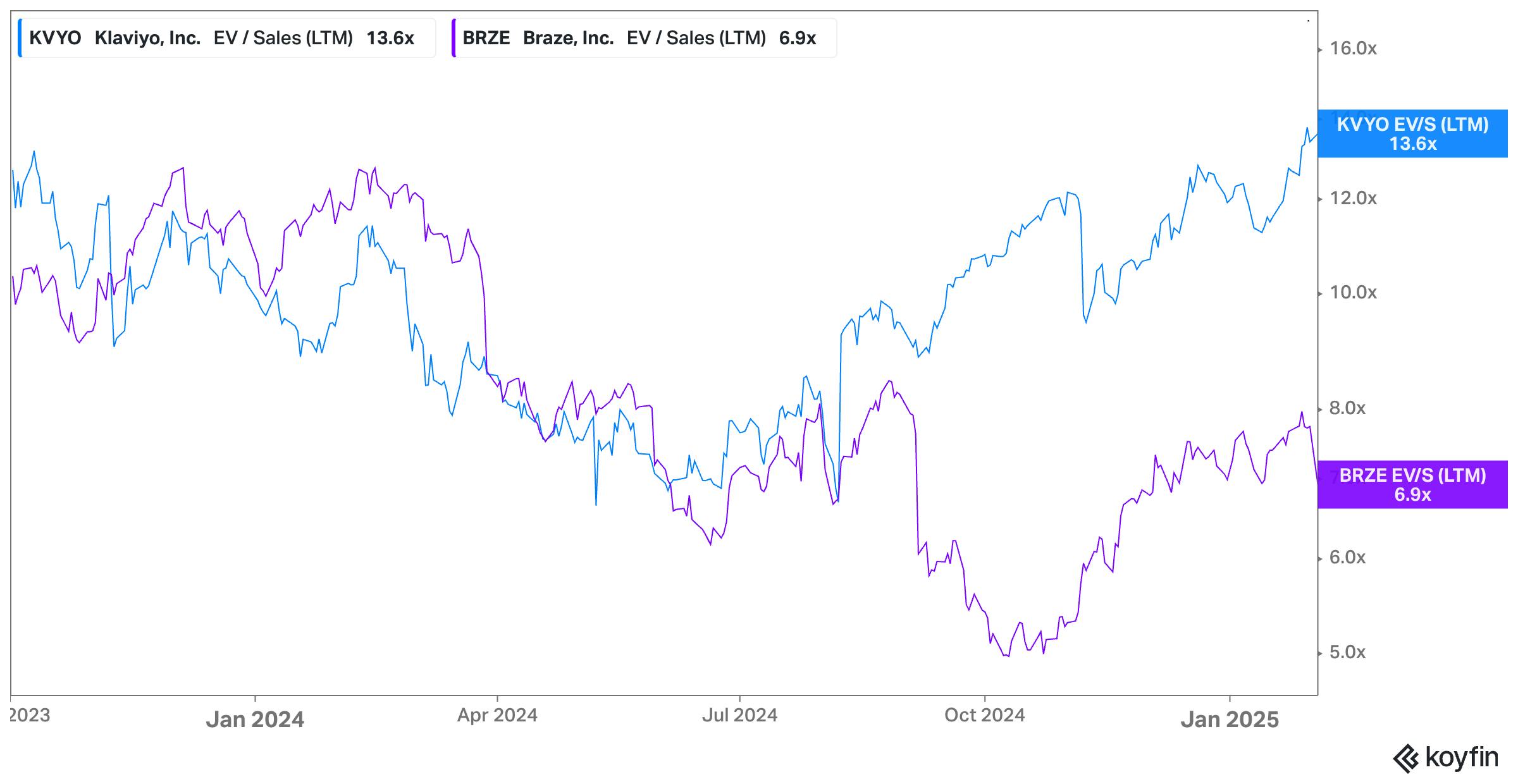 Based on the company’s $500 million of ARR in 2024, that would represent a 14x LTM ARR multiple at its prior valuation of $7 billion in 2021. However, in secondary markets, Attentive is valued at a range from $2.7 billion to $5.8 billion according to marks from mutual fund investors, like BlackRock. That would represent an LTM ARR multiple range of 5.4-11.6x. In the public markets, comparable companies like Braze and Klaviyo trade at a range of 6.9x to 13.6x LTM revenue.