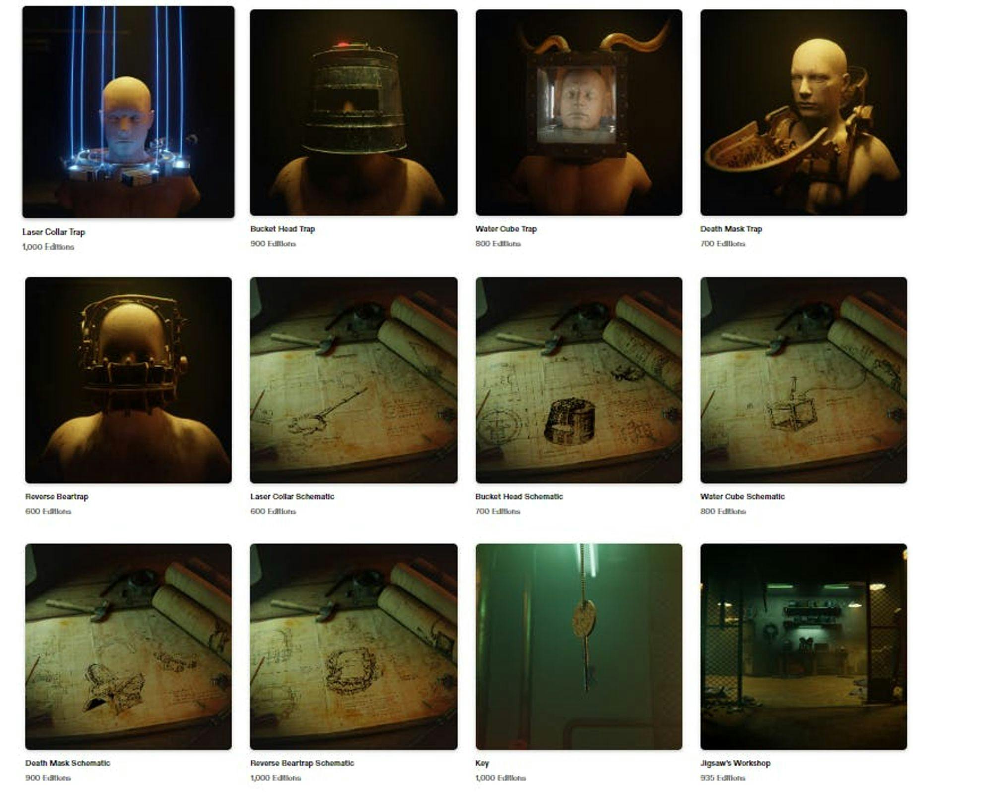 This collection, dropped on October 28th, 2021, includes five Traps, five Schematics (each corresponding to a trap), one Key, and one Jigsaw Workshop, each with up to 1K editions. Users may complete a “Set” by acquiring (1) one trap, (2) the corresponding schematic (for example, the Reverse Beartrap corresponds to the Reverse Beartrap Schematic), and (3) a unique key that will correspond to all traps and schematics. The Key would also unlock privileges in connection with future Saw or Lionsgate drops or experiences.