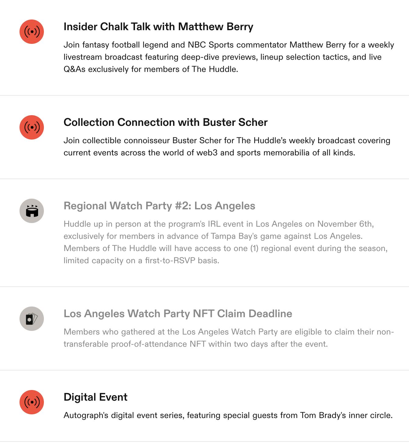 Members gain access to The Huddle by owning a Season Ticket NFT — a dynamic NFT that allows holders to participate throughout Tom Brady’s 2022-2023 season. The Huddle introduces offerings enabled by its token-gated structure, such as digital events, in-person gatherings, and custom merchandise. For example, these were some of the events from November 2022: