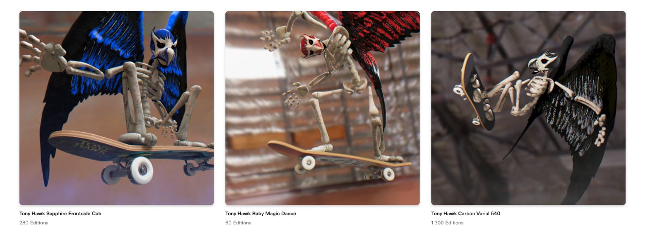 Another notable example was the Tony Hawk Last Trick Skateboard Collection. This collection was launched in December 2021 to commemorate Hawk’s retirement of five of his “most memorable tricks, with each trick memorialized in the form of limited-edition NFTs that will live on forever.” Each NFT was a 3D scanned digital replica of the exact board Tony Hawk used to complete the trick, and the primary buyer of the NFT received the physical version of the skateboard via mail. Both the physical skateboards and their digital replicas were signed by Tony Hawk.