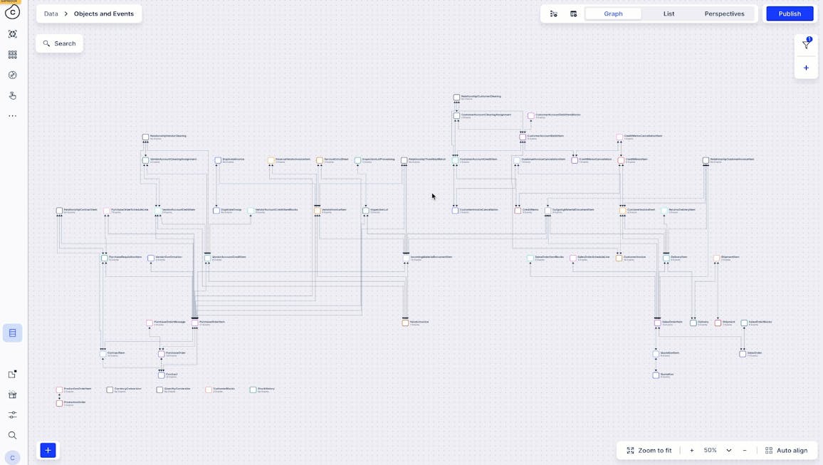 Celonis’s process intelligence graph is used to map and analyze business processes. It takes in event log data from applications and systems a company already uses, transforms that data into standardized process data, and layers on Celonis’s process mining software and AI capabilities to capture real-time process performance. The graph allows businesses to access a digital replica of how their business processes work and track every object (e.g. invoices, orders) and event (e.g. order creation and invoice payment) in their processes. It also allows businesses to model future process changes by adding events or objects to the digital replica.