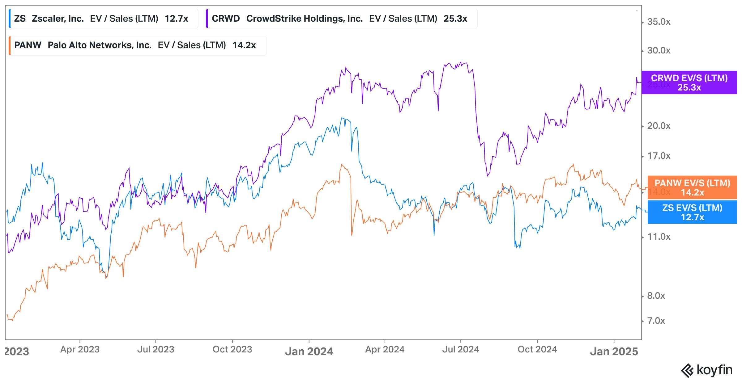 Public cybersecurity firms had reached record levels of market capitalization at the end of 2024. Notable examples include ZScaler at $26 billion and Crowdstrike at $71 billion. Palo Alto Networks exceeded a $100 billion market capitalization, marking it the most valuable cybersecurity firm. These valuations represent the growing demand for cybersecurity services among large enterprise customers globally. Research from Bessemer Venture Partners also indicates public cloud cybersecurity companies outperform in terms of valuation multiples and revenue growth rates compared to public cloud infrastructure companies.