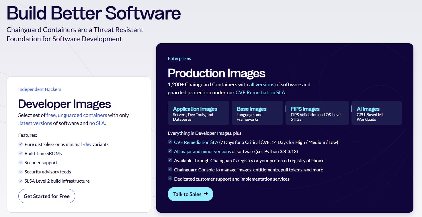 Chainguard offers free and paid versions of secure container images in the form of Developer and Production Images. Developer Images are a select set of free-to-use container images with the latest version of software for independent developers. Production Images are paid container images that include all versions of software and specific image types depending on entitlements added to the subscription. The decision to offer free and paid container images allows open-source software to be maintained and independent developers to build secure software while providing paid enterprise-ready images for organizations.