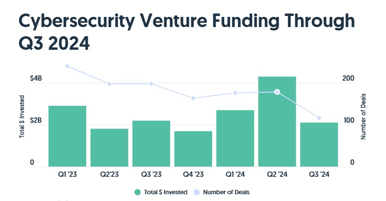 Venture Capital funding for cybersecurity startups rebounded at the beginning of 2024 from $1.6 billion in Q4 2023 to $2.7 billion in Q1 2024 across 154 deals. However, in Q3 2024, funding for cybersecurity startups declined, mirroring the performance of the global funding market, with a decrease in deal flow of 41% compared to the previous year and 35% compared to Q2 2024. A survey of 400 private cloud companies revealed that cybersecurity cloud companies had the highest number of companies with $300 million in cash on their balance sheets.