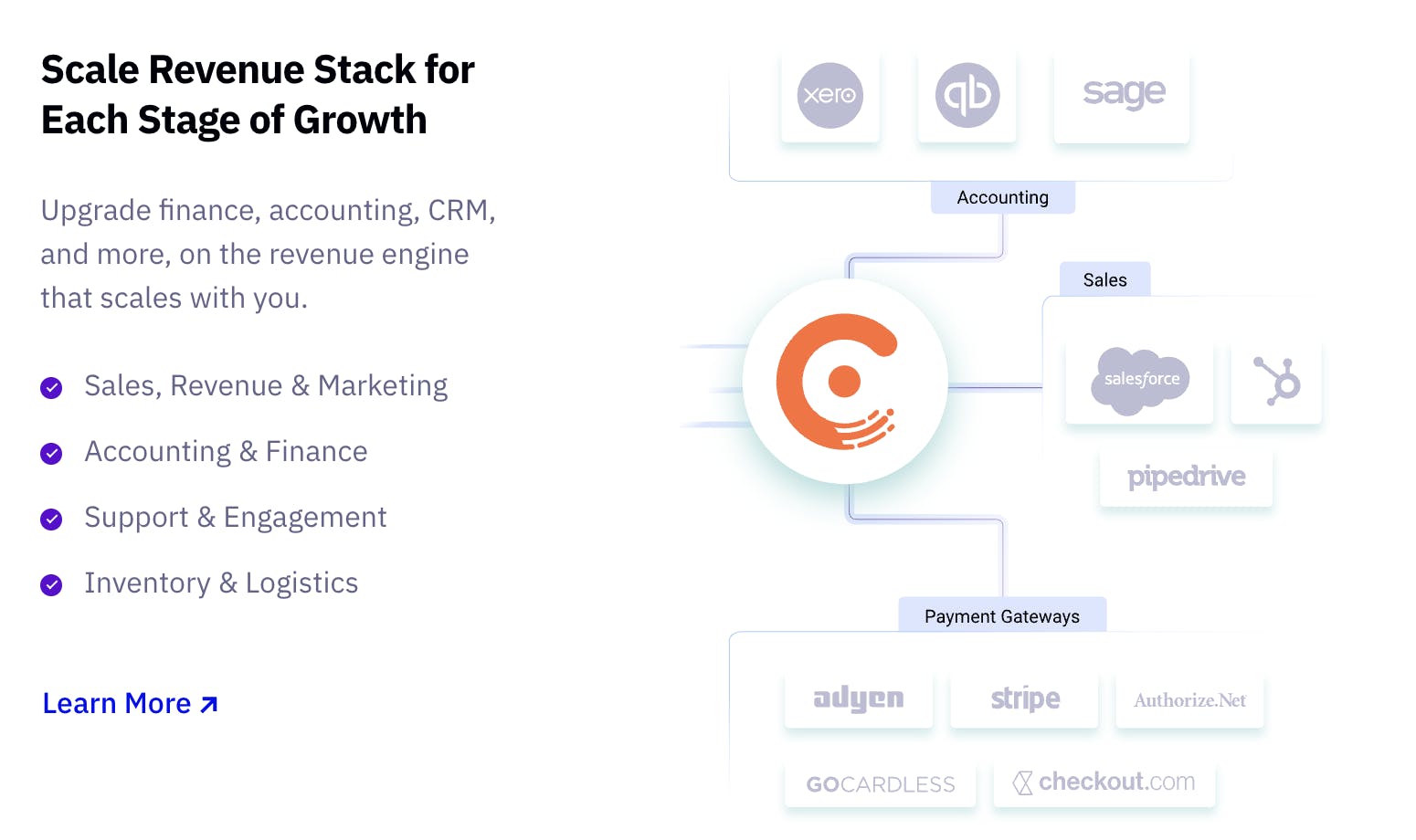 Chargebee’s integrations with a wide range of third-party apps extends billing platform capabilities and help teams work efficiently by streamlining information across functions and automating workflows. Categories include accounting software, helpdesk providers, collaboration tools, and CRMs.