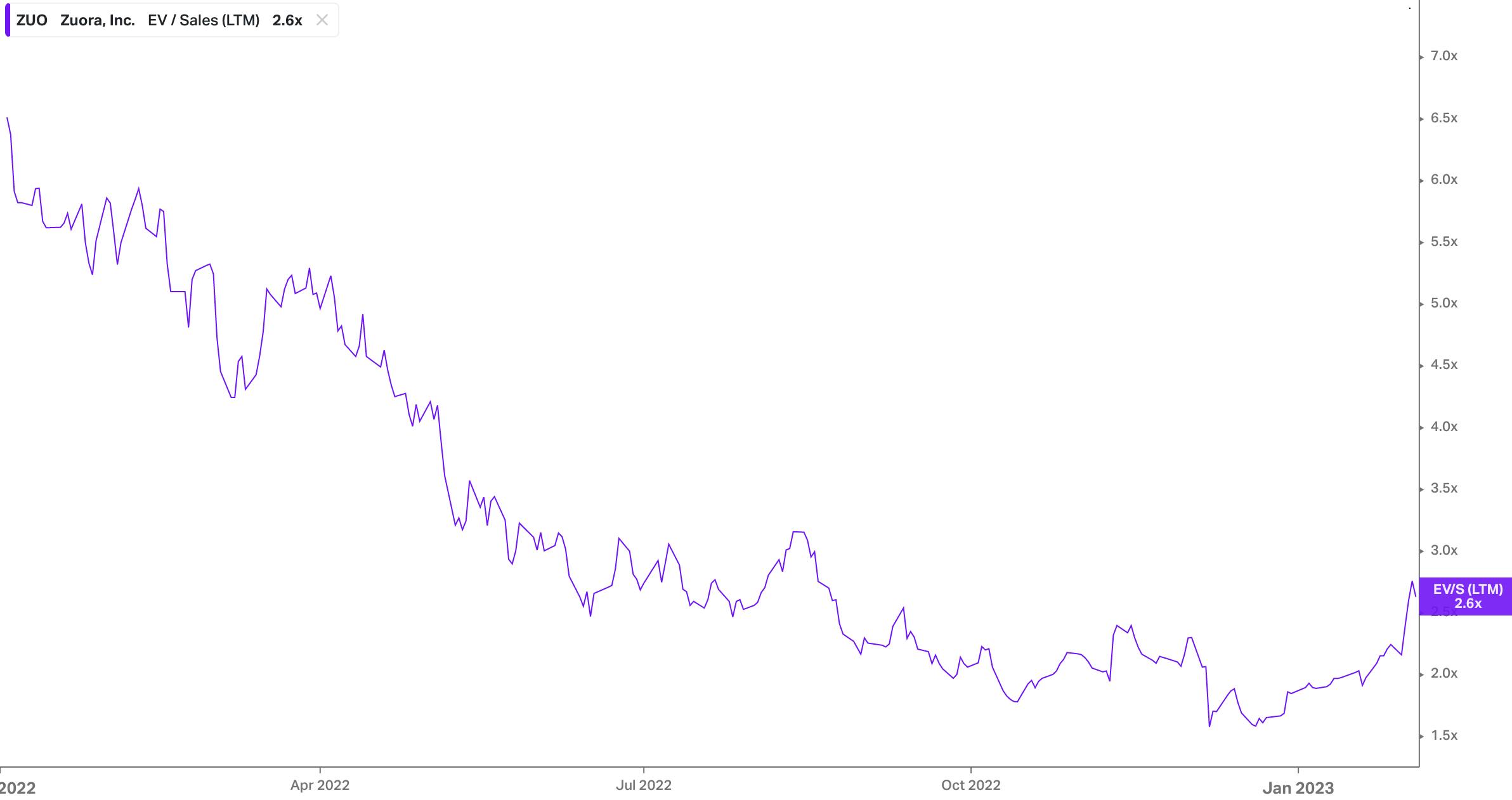 Chargebee’s revenue was reported by one source to be at $115.4 million in 2022. Taking a conservative estimate and assuming Chargebee’s 2021 revenue was in the range of $50-100 million, the latest valuation implies a 35-70x multiple. Chargebee’s competitors are primarily private companies. Zuora ($384 million LTM revenue, 14% YoY growth), Chargebee’s closest publicly traded competitor, has seen its revenue multiples decline from a high of ~7x in 2022 to current levels of ~3x.