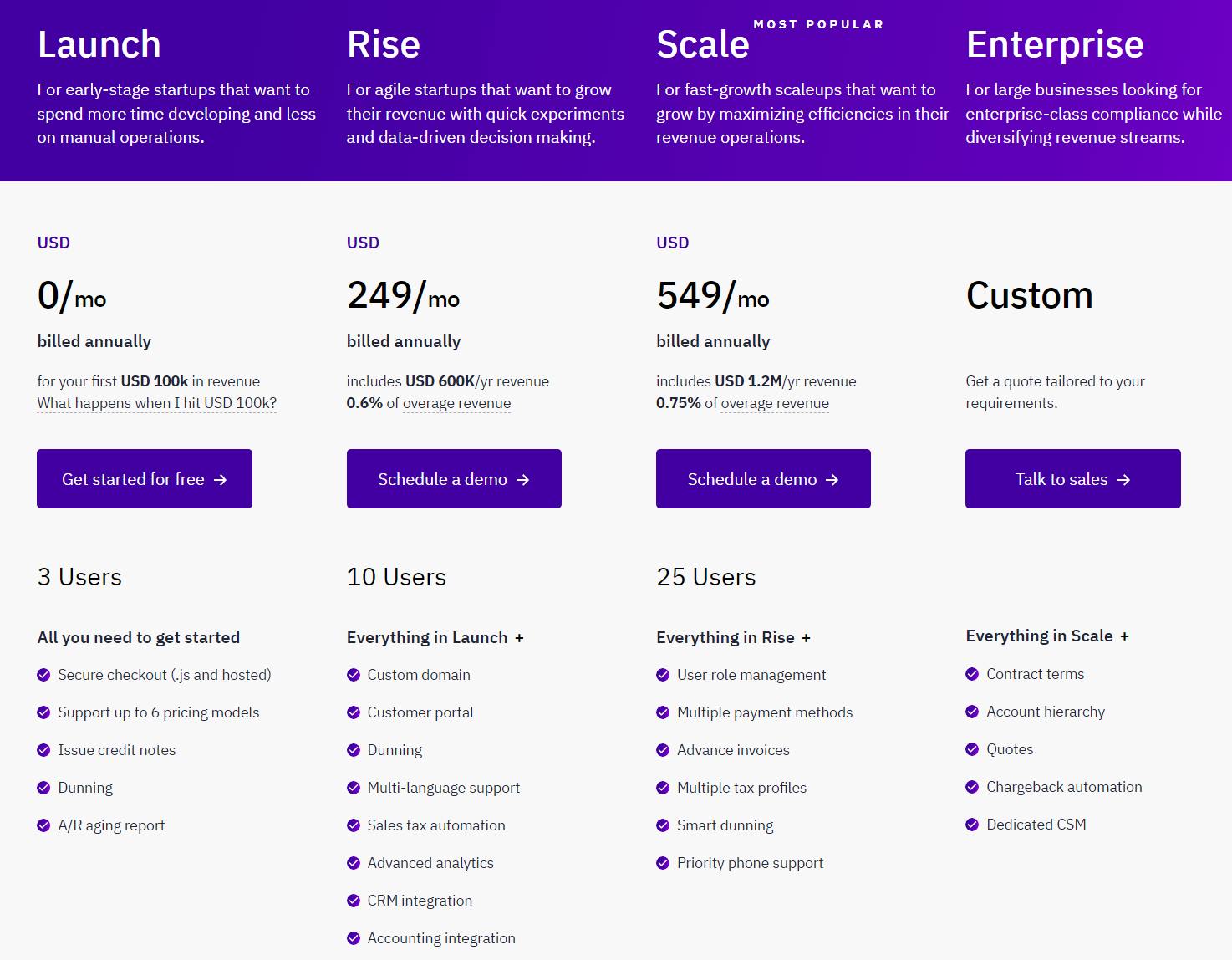 Launch: Free for early-stage startups generating under $100K in annual revenue. If a customer surpasses this amount and wants to continue with the plan, Chargebee bills them at $99 per month with a 0.5% overage fee.