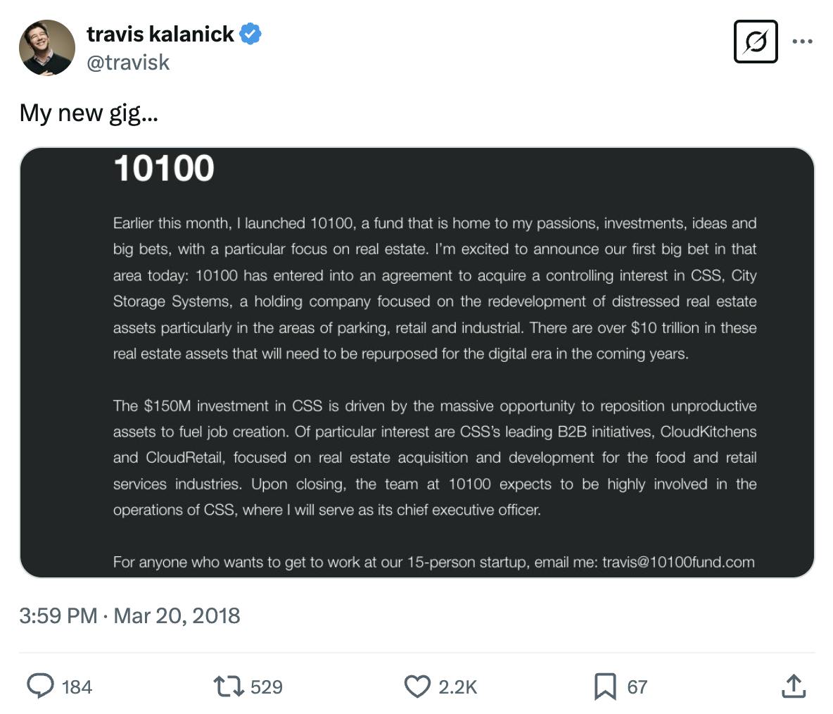 In 2017, CloudKitchens raised a Series A led by Craft Ventures and Social Capital. Just two years later, Uber’s founder and former CEO Travis Kalanick bought a controlling interest in CSS for $150 million and became the company’s CEO. Several months before the buyout, Kalanick resigned from Uber and sold 90% of his shares for a profit of $2.5 billion.