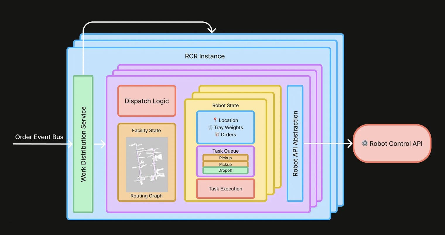 Beyond food assembly, Lab37 has also developed a robotic conveyance system to optimize the movement of food within its facilities. The Robotic Conveyance Routing (RCR) system controls robots manufactured by Bear Robotics to transport orders from individual kitchens to designated pickup areas, ensuring a seamless handoff to couriers. The system leverages multi-order trips, where a single robot picks up multiple orders before heading to the pickup station, as well as predictive dispatch, where robots are sent to kitchens before orders are even completed based on real-time demand forecasting.