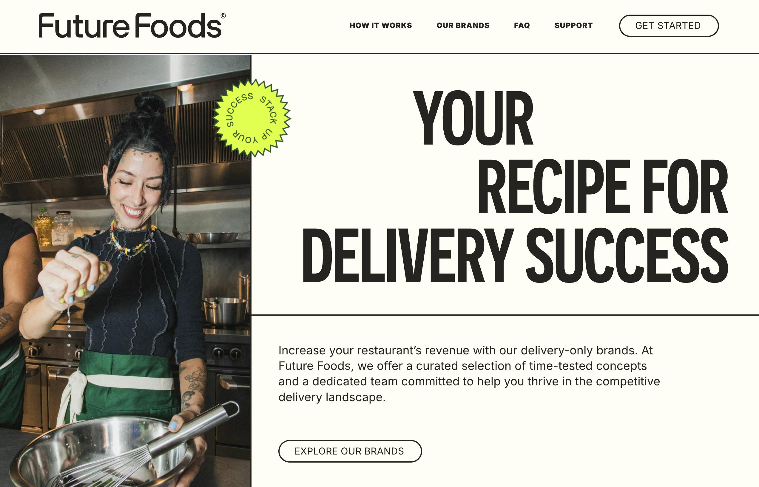Future Foods, CloudKitchens’ virtual brand division, allows existing restaurants to operate additional delivery-only brands. Participating restaurants receive pre-designed menus, marketing assets, and demand generation support in exchange for a revenue share model, typically around 10% of sales.