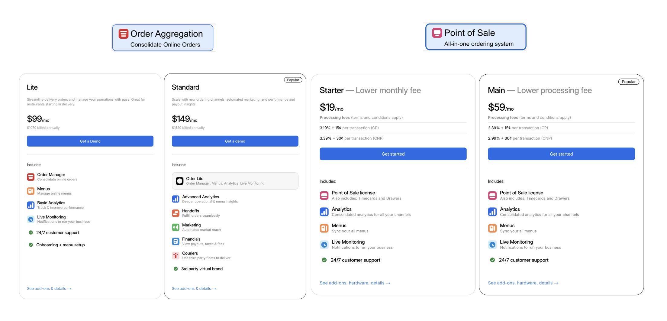 Otter operates as a standalone SaaS business. It offers order aggregation, point-of-sale (POS) functionality, and marketing tools to restaurant operators, generating revenue through subscription fees. Restaurants using Otter can manage their delivery presence across multiple platforms, with some opting for an all-in-one package that includes hardware and payment processing for a monthly fee. Otter charges on a per-location basis, with two tiers for its POS solution ($19 per month or $59 per month + processing fees, hardware and add-ons), and two tiers for Order Aggregation ($99 per month or $149 per month + add-ons).