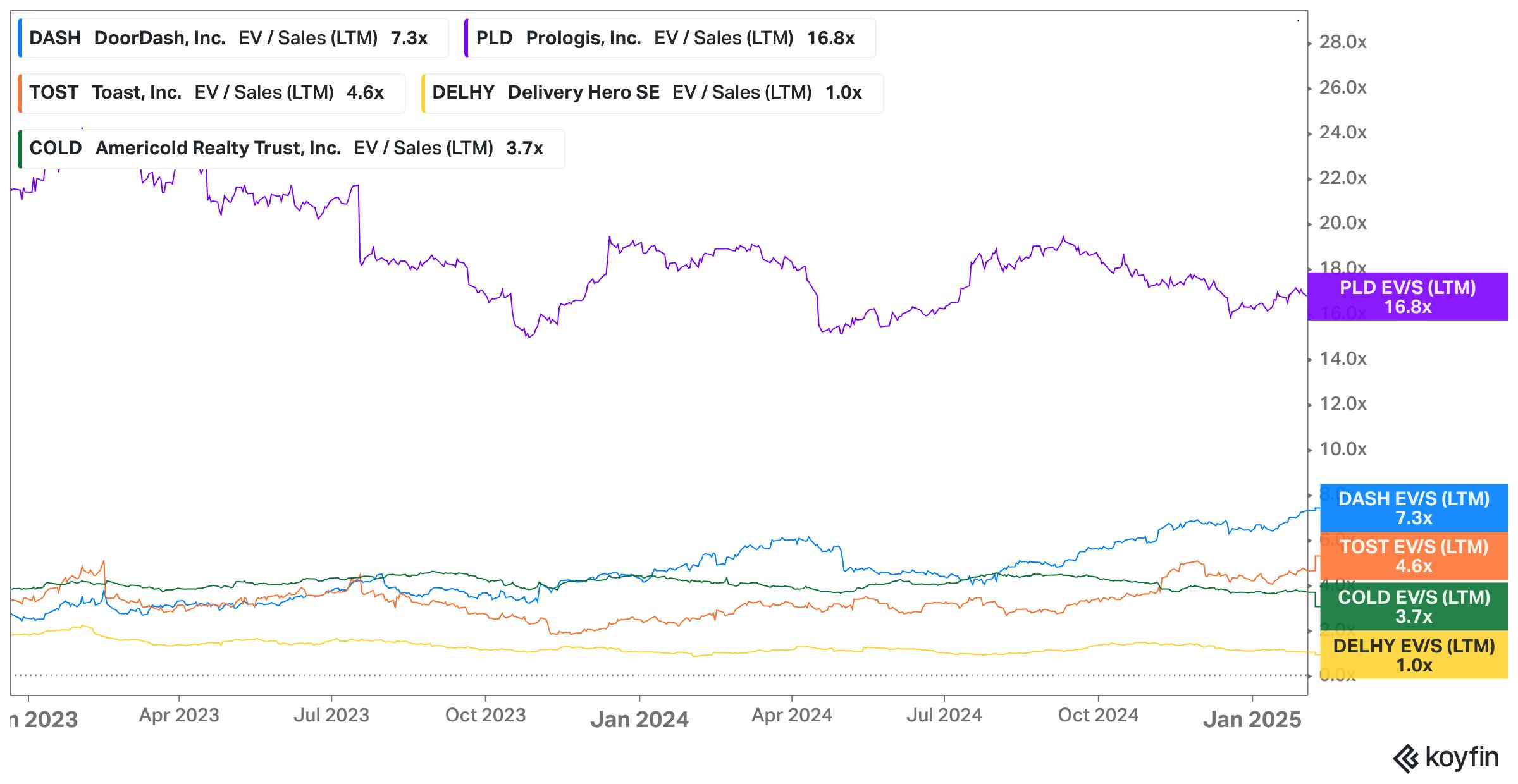 Based on the one unverified estimate of CloudKitchen’s revenue at $1.1 billion, the company’s 2021 valuation of $15 billion represents a 13.6x LTM revenue multiple. CloudKitchen’s broader business is complex and involves a number of operating components: (1) real estate and restaurant operations, (2) POS and software, and (3) marketing services. Real estate companies like Prologis and Americold Realty Trust trade at the opposite ends of the spectrum, from 16.8x LTM revenue to 3.7x LTM revenue respectively. Meanwhile, food delivery companies like DoorDash and Delivery Hero can also trade at a broad range, from 7.3x LTM revenue to 1.0x LTM revenue respectively.