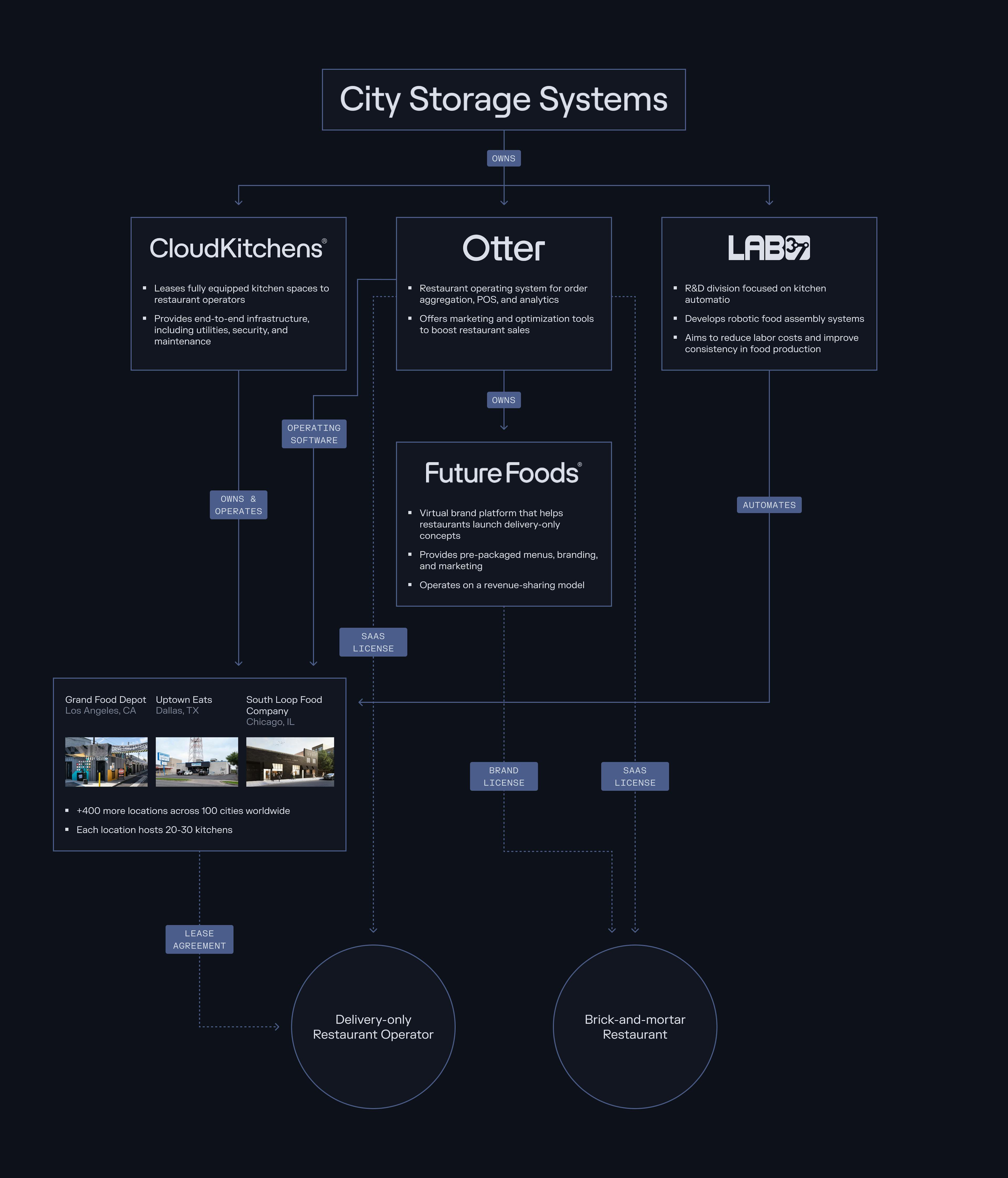 CloudKitchens is part of City Storage Systems (CSS), a real estate and technology holding company focused on repurposing distressed real estate assets into modern food delivery infrastructure. CSS owns and operates CloudKitchens, which provides kitchen spaces for delivery-only restaurants, Otter, a restaurant software and order management platform, and Lab37, a robotics and automation division aimed at optimizing food production.