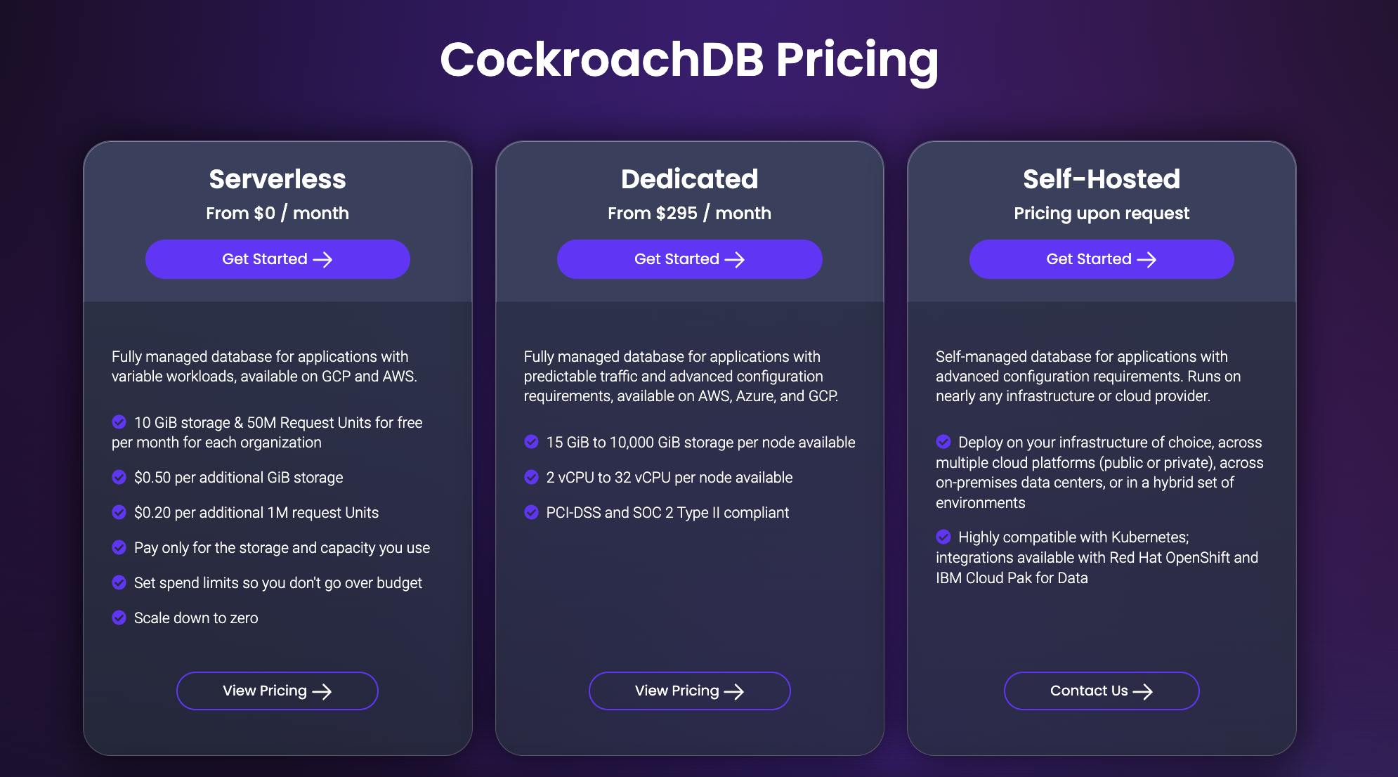 CockroachDB Self-Hosted: Cockroach Labs does not publicly provide pricing for CockroachDB Self-Hosted on its website. Most customers choosing self-hosted deployment are likely large enterprises, where pricing is custom and negotiable for each client.