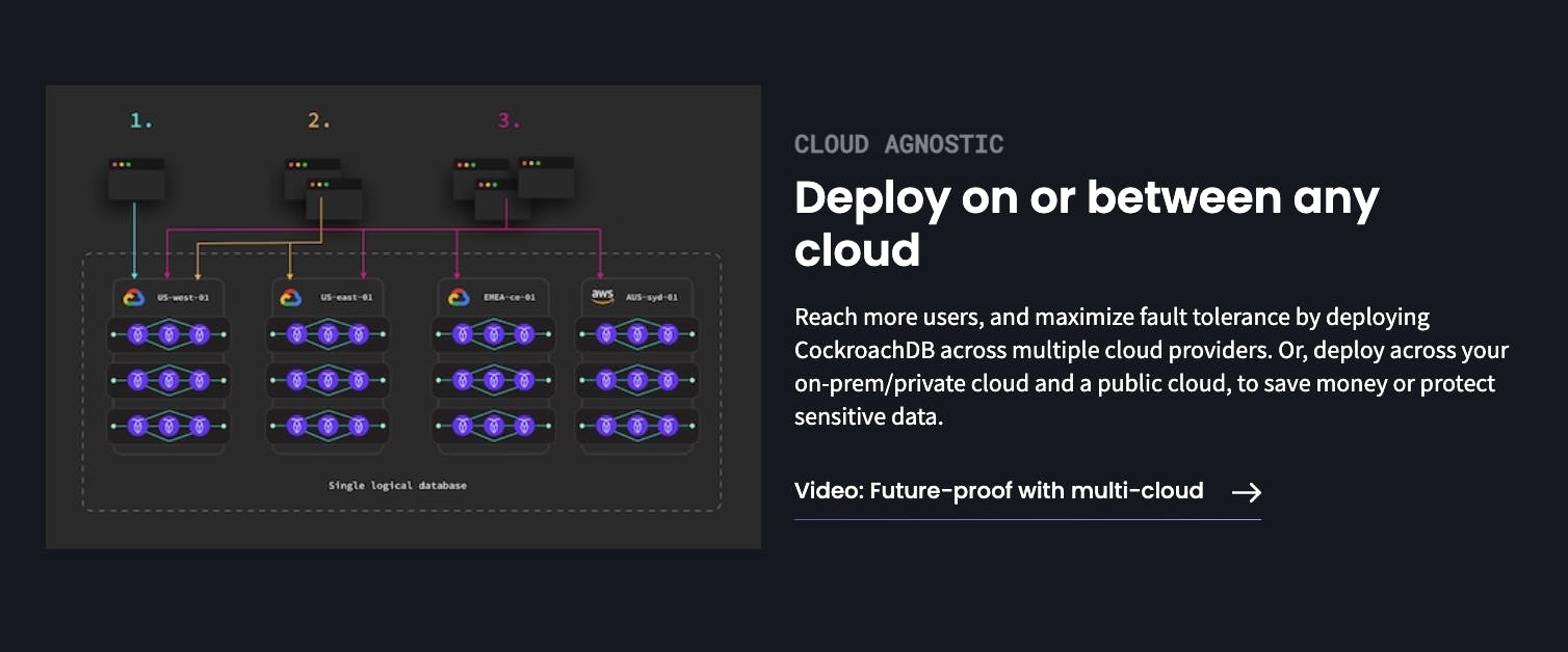 Users can deploy CockroachDB on any cloud platform, unlike databases offered directly by cloud vendors such as AWS Aurora and GCP Spanner. Cockroach can also be deployed on multiple clouds at once such as AWS, GCP, and Azure. Multi-cloud deployments prevent dependence on a single cloud provider (i.e. vendor lock-in).