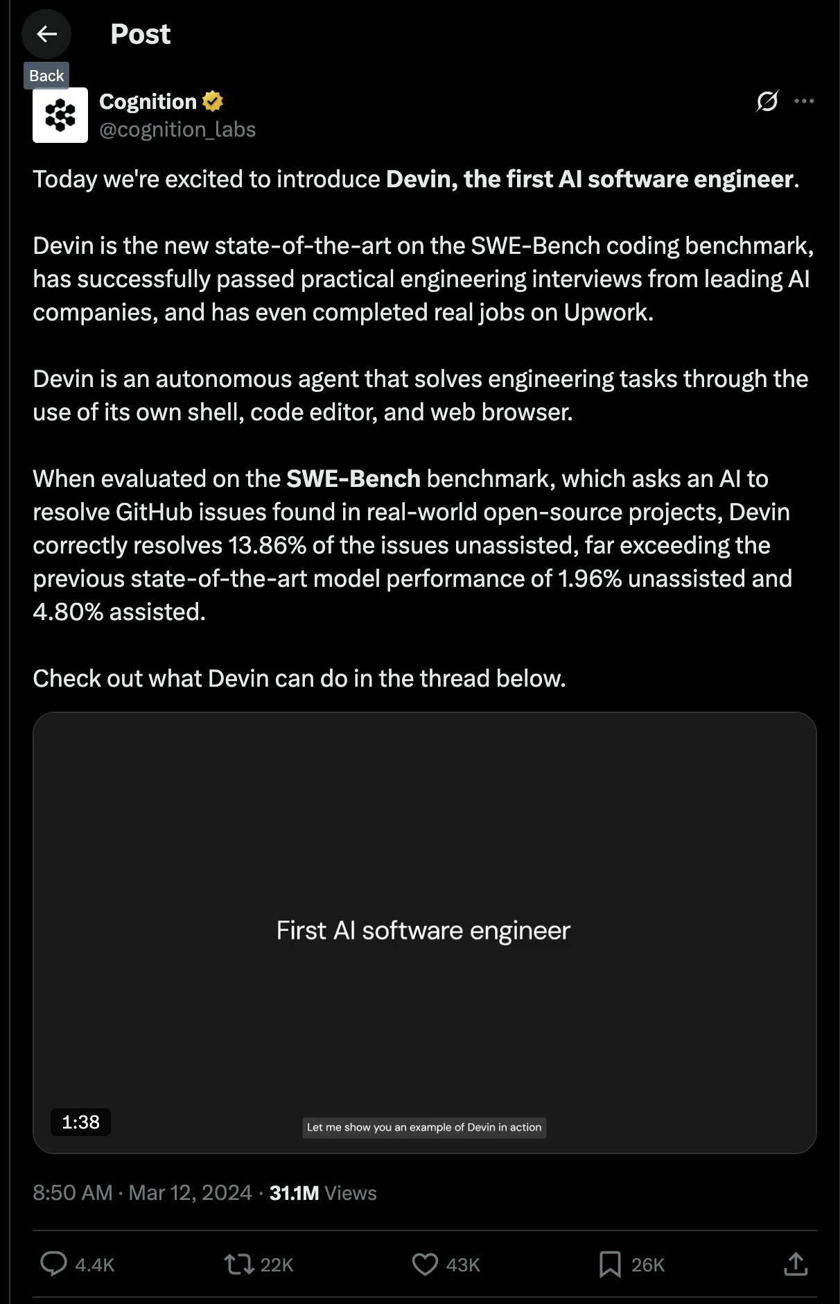 Devin, developed by Cognition, is claimed to be the first fully autonomous AI software engineer. Unlike copilots that assist human programmers, Devin executes entire software projects and resolves 13.9% of real-world GitHub issues end-to-end on SWE-bench — far outperforming GPT-4’s 1.7% and Claude 2’s 4.8% as of March 2024. Overall, Cognition’s vision is to offer a scalable alternative to human engineers through autonomous AI coding agents.