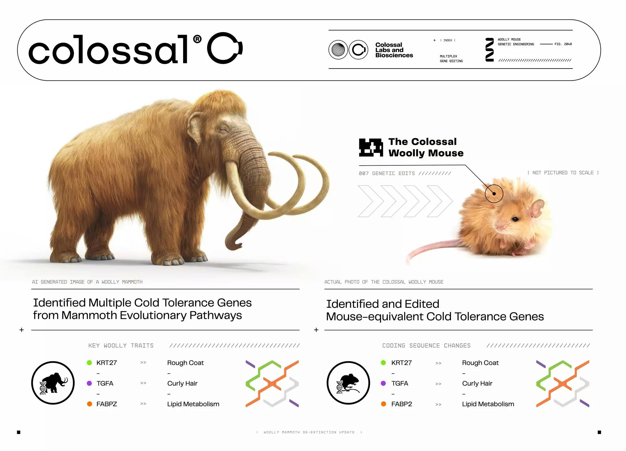 In March 2025, Colossal Biosciences announced the creation of "woolly mice" with mutations inspired by woolly mammoths. These genetically modified mice exhibit long, wavy, woolly hair of a golden color and accelerated fat metabolism. The woolly mice experiment involved identifying seven genes that code for the mammoth's shaggy coat (specific genes for coarseness, curliness, and length), one gene for melanin production (giving the golden color), and another governing lipid metabolism. Over five rounds of experiments, scientists produced nearly 250 embryos, with fewer than half developing to larger, more viable 200-300 cell embryos. These were implanted in around a dozen surrogate female mice, resulting in the birth of 38 mouse pups that successfully expressed the desired mammoth traits.