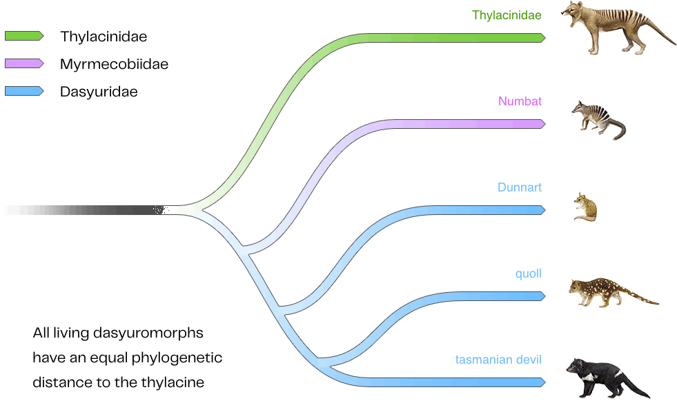 The fat-tailed dunnart (Sminthopsis crassicaudata), a small mouse-sized marsupial and threatened species, has been identified as a candidate for DNA usage, given its close relation to the thylacine. The de-extinction process will involve using CRISPR gene-editing technology to modify the fat-tailed dunnart genome to more closely resemble that of a thylacine. In October 2024, Colossal announced that they had edited more than 300 unique genetic changes into a fat-tailed dunnart cell line, making it the most edited animal cell to date at the time.