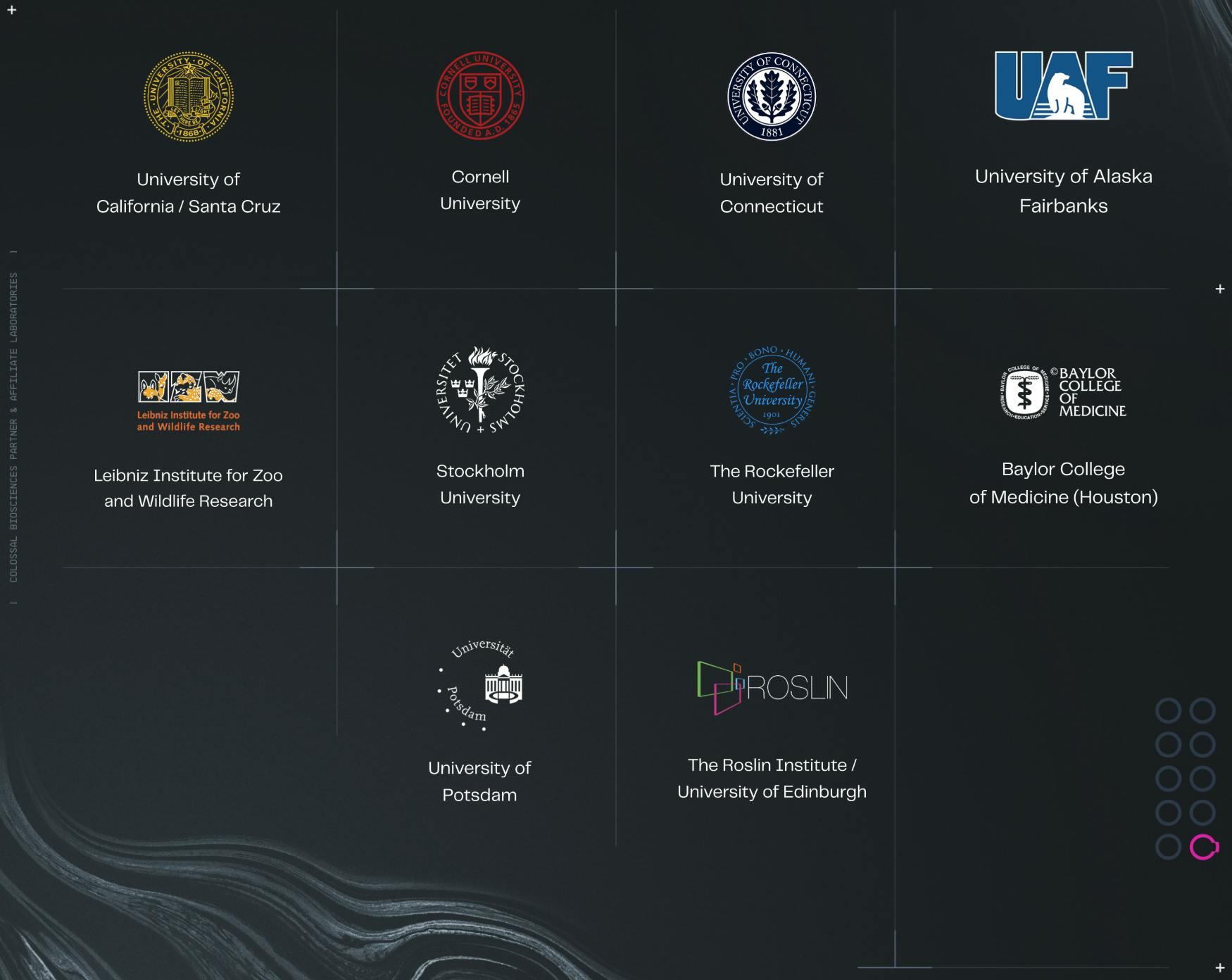 Colossal Biosciences maintains a workforce of over 170 scientists and 95 advisors distributed across four specialized laboratories (including the Church Lab, TIGRR Lab, and two other labs in Boston and Dallas) as of January 2025. These teams are divided by project and span disciplines including computational biology, cell and genome engineering, stem cell biology, embryology, protein engineering, and assisted reproductive technologies. Colossal Biosciences also maintains partner laboratories across the world.