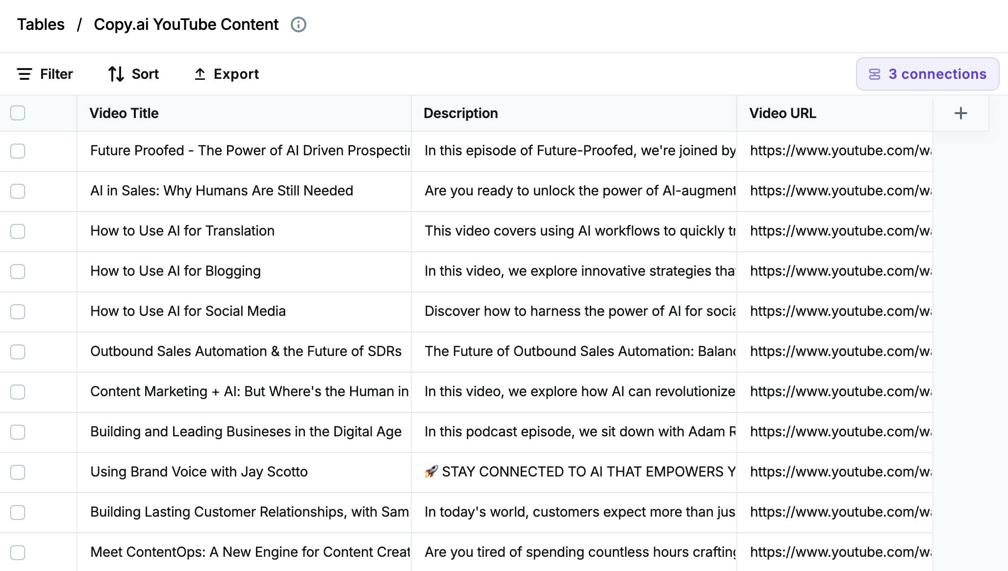 Tables centralize both structured data (like spreadsheets) and unstructured data (like notes) from various sources like CRM systems, call transcripts, and document management platforms. By synchronizing and updating data in real-time, GTM teams can access a cohesive view of customer interactions, sales progress, and marketing efforts, eliminating data silos and improving cross-functional collaboration. Centralizing data sources helps teams conduct advanced data analytics, allowing teams to combine diverse data types and gain additional insights into customer behavior and performance trends.