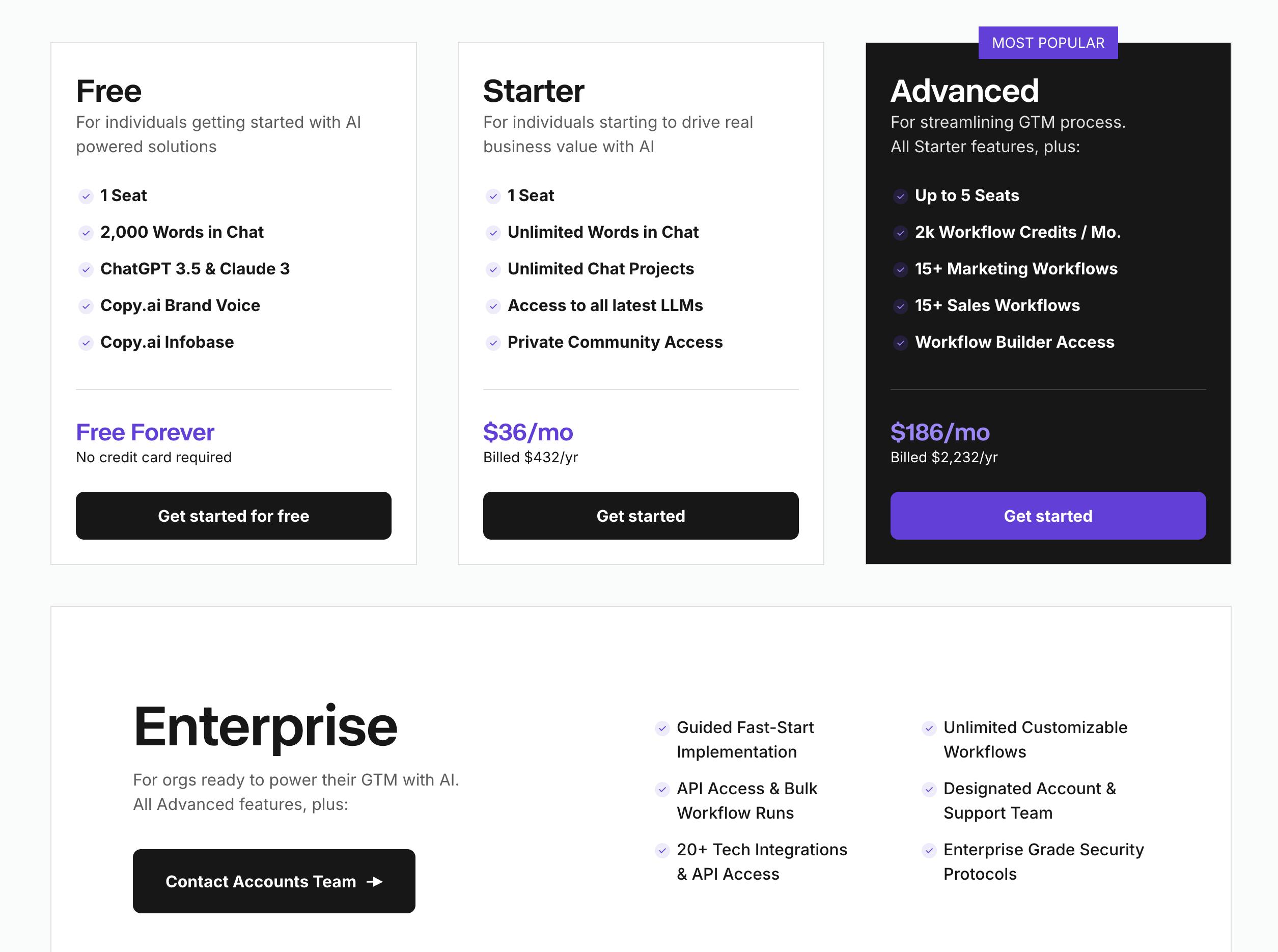Free Tier: The Free Tier allows users to explore Copy.ai's basic features without any financial commitment. This plan includes one user seat and provides 2K words per month in Chat. Users have access to basic writing tools through Chat, including AI article generation and social media content creators. They can also use Infobase to store and organize company information.