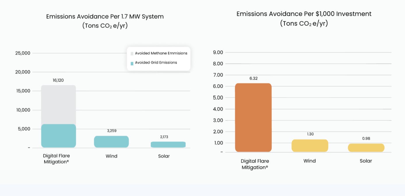The Digital Flare Mitigation system is a product that captures wasted natural gas from oil fields and converts it into electricity to power on-site data centers.