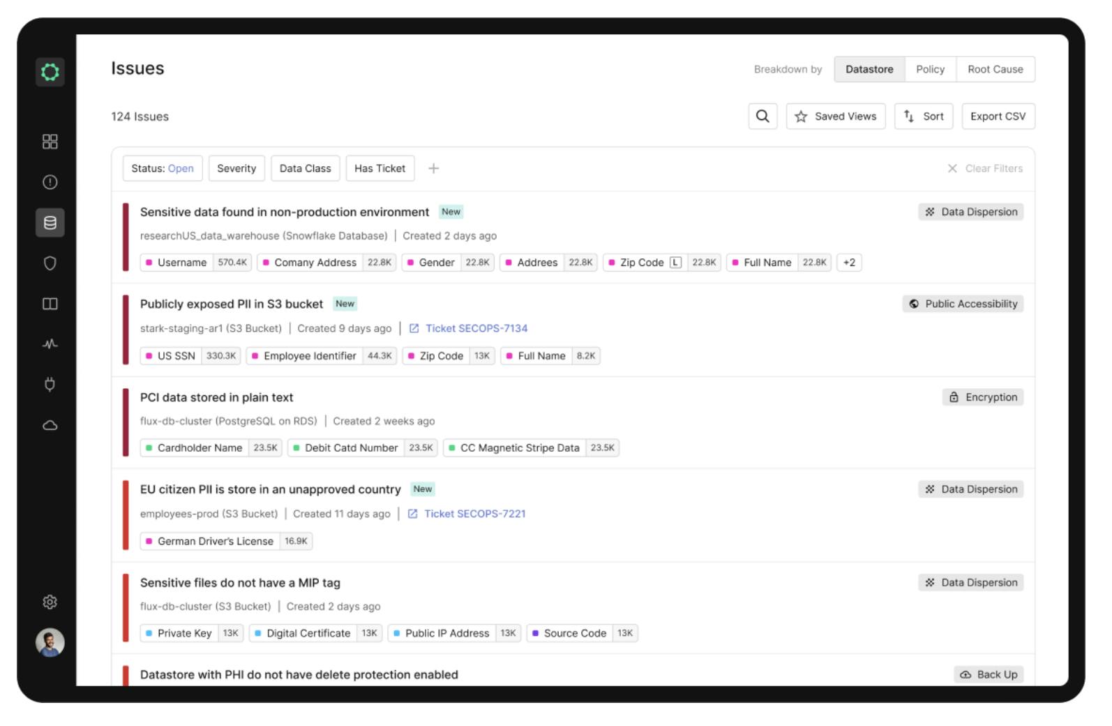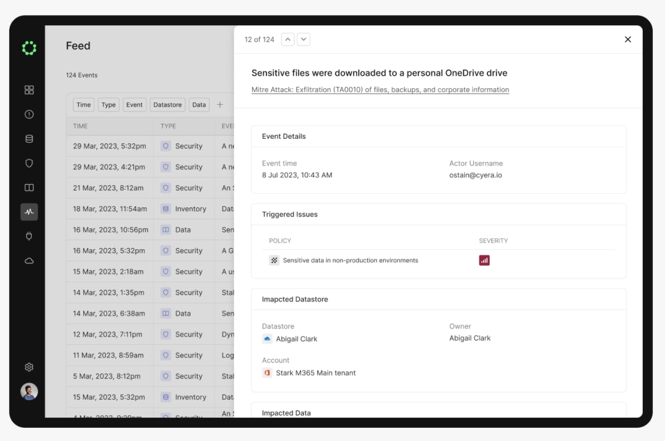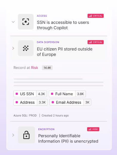 Cyera provides security teams with the visibility they need to manage risks around how data is stored, used, and moved. It identifies when sensitive data is in the wrong place, accessed in unusual ways, or exposed through changes to databases or configurations. This allows teams to apply the right security measures and prevent data breaches or misuse.