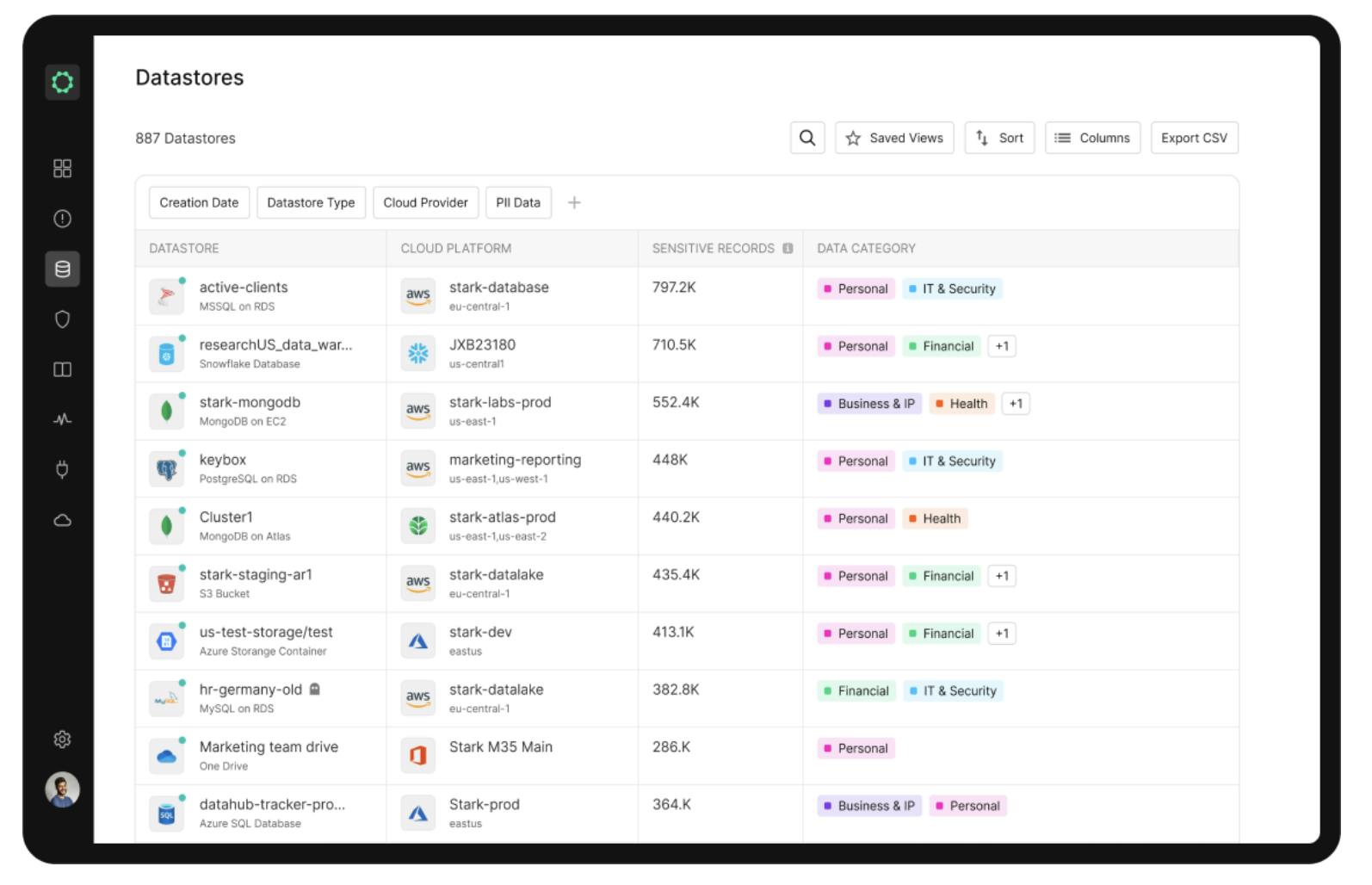 Automatic Data Store Discovery: Cyera’s deployment system enables automatic and continuous detection of all data storage locations, including those that are known, overlooked, or newly created, essentially helping organizations stay updated on data sprawl and address potential security risks or compliance issues.