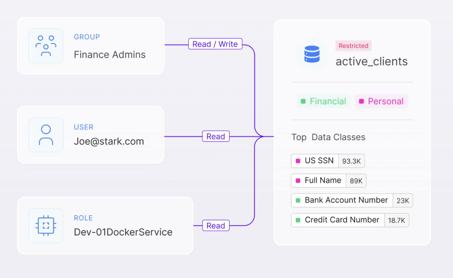 Cyera enforces data access policies to ensure only the necessary individuals and systems have access to sensitive information, following the principle of least privilege. The platform identifies when access to data—whether structured (like databases) or unstructured (like documents)—is overly broad or risky. It evaluates the potential impact of this access by considering the sensitivity of the data and relevant compliance frameworks. Cyera provides insights into both human and automated users accessing data stores, the type of sensitive information they can reach, and any activities that increase the risk of data breaches, loss, or exposure to ransomware. This allows security teams to tighten controls proactively and prevent potential threats.