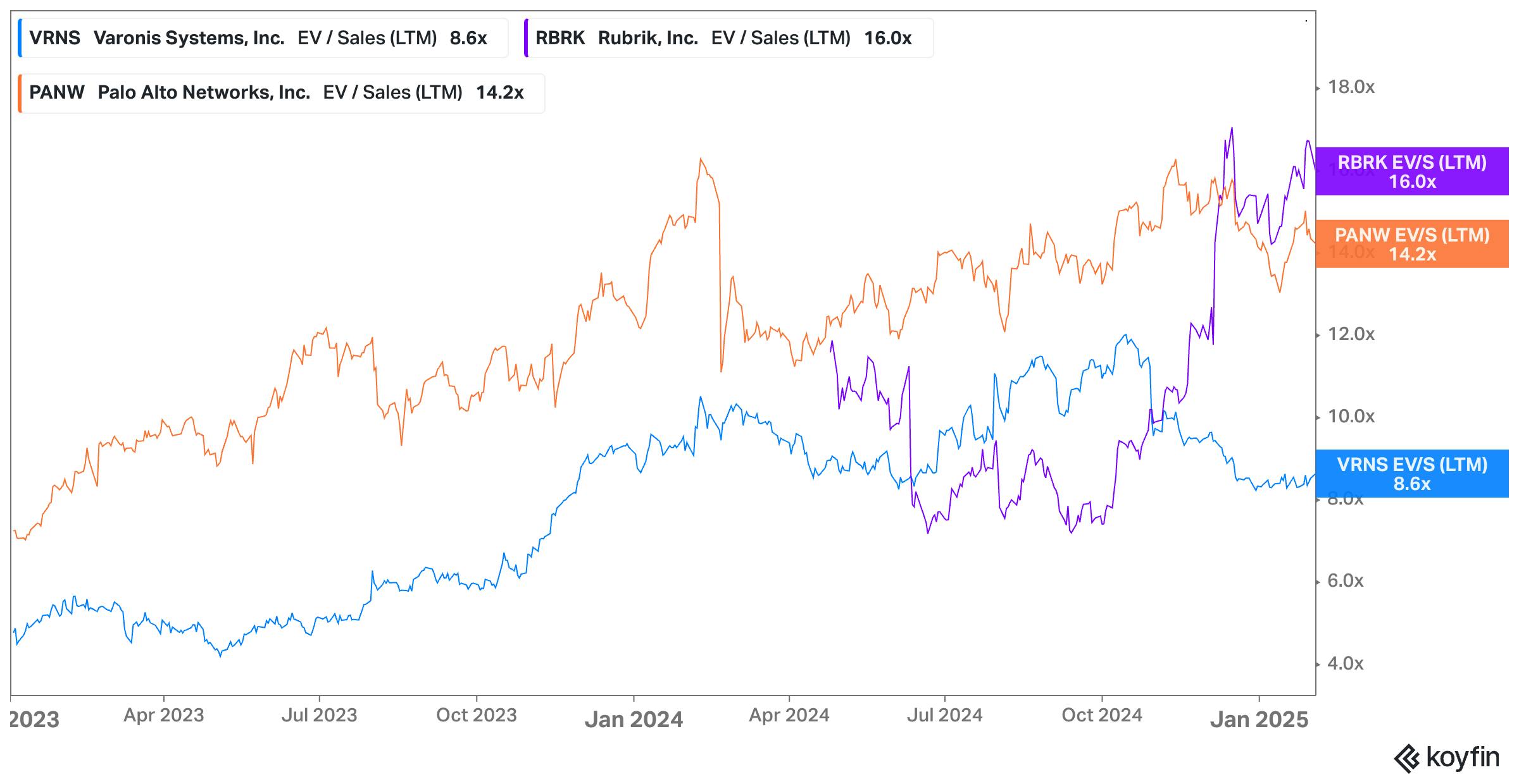 Cyera's acquisition of Trail Security positions the company to compete more aggressively in the cybersecurity space more broadly against established players. Publicly-traded competitors, such as Palo Alto Networks, Rubrik, and Varonis operate at a variety of scales. These companies trade at a range of LTM revenue multiples from 8.6x to 16x as of February 2025. If the unverified estimate for Cyera’s 2024 revenue of ~$70 million is accurate, its November 2024 valuation of $3 billion would represent a 42.8x LTM revenue multiple.