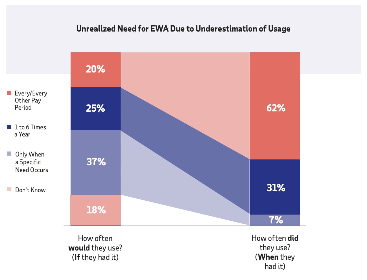 DailyPay was the “global leader” in EWA volume as of April 2023 and the second largest user of the TCH payments network, with its employee transfers claiming one in 10 real-time payments. This is partly reflected by statistics suggesting the actual rates of EWA use exceed the expectations of interested users. According to a 2022 survey, 37% of employees who do not have access to EWA estimated they would request an early payment only when a specific need occurred and only 20% suggested they might use it every pay period or every other pay period. Yet in practice, the majority of employees (62%) who have access to EWA indicated they request early access every or every other pay period, and only 7% indicated that they used EWA only when a specific need occurred.