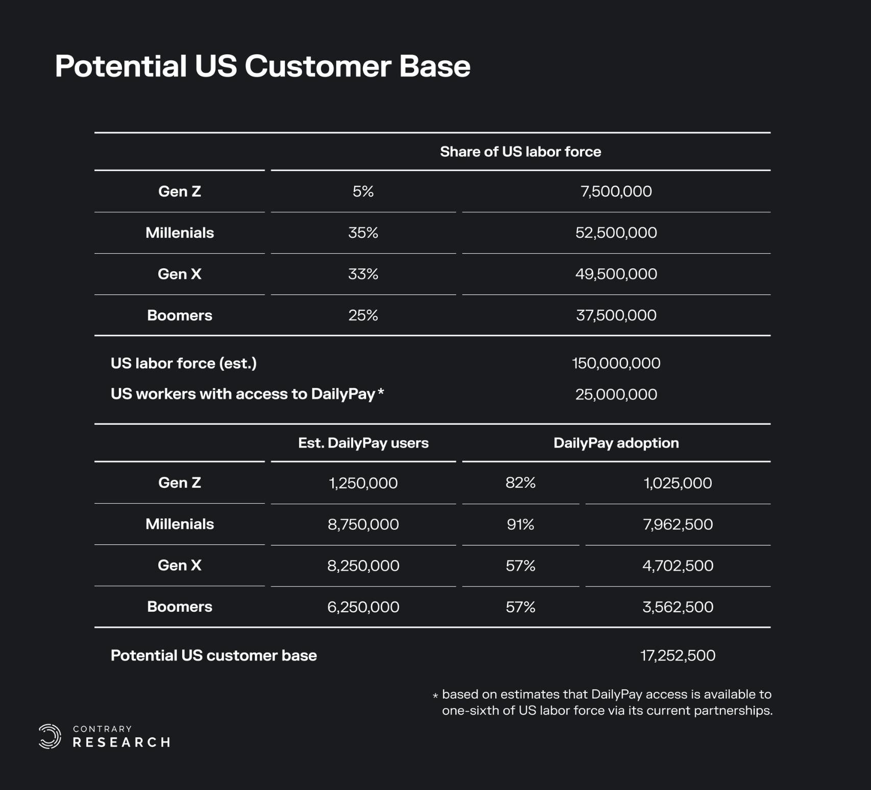 DailyPay’s horizontal partnerships with HCM providers mean that one in six American workers now have potential access to DailyPay if their employer chooses to integrate it through their existing HCM. If employed Americans number around 150 million, this would indicate a potential addressable market of 25 million US workers. However, by DailyPay’s own statistics, younger workers are more likely to adopt and use earned wage access services than older generations, putting this figure closer to 17.2 million US workers. Rob Nardelli, DailyPay’s head of business development, said in April 2023 that the company covered just 3% of the market, suggesting it has room to grow.